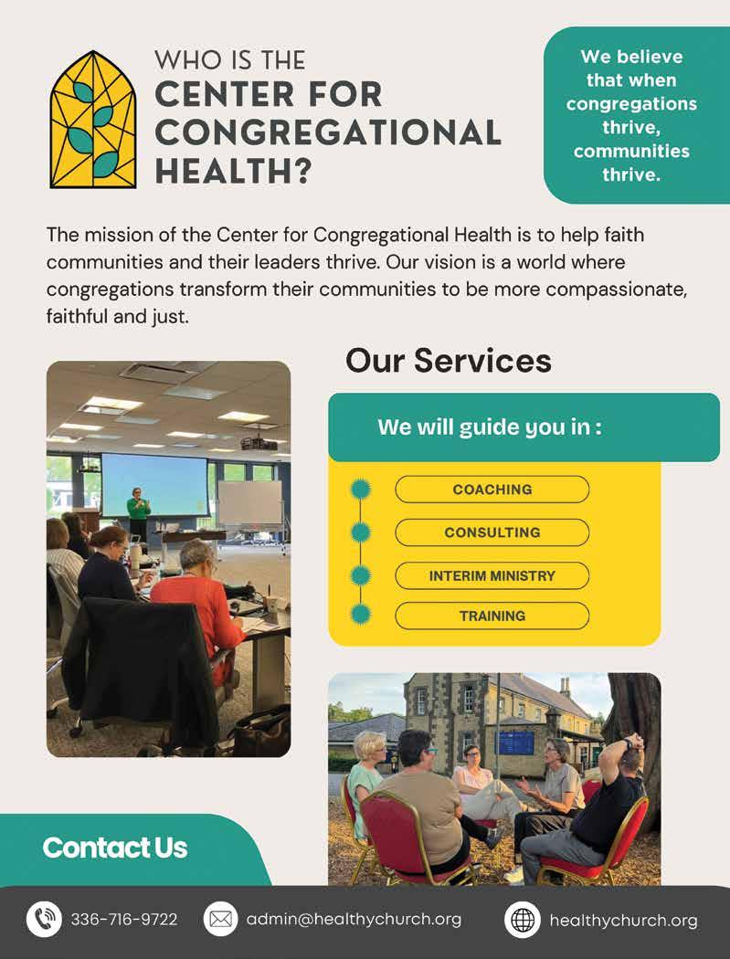Refreshments are located in the Exhibit Hall (Hailey Hall) and are made available through the generosity of our sponsors—Center for Congregational Health and Center for Healthy Churches.