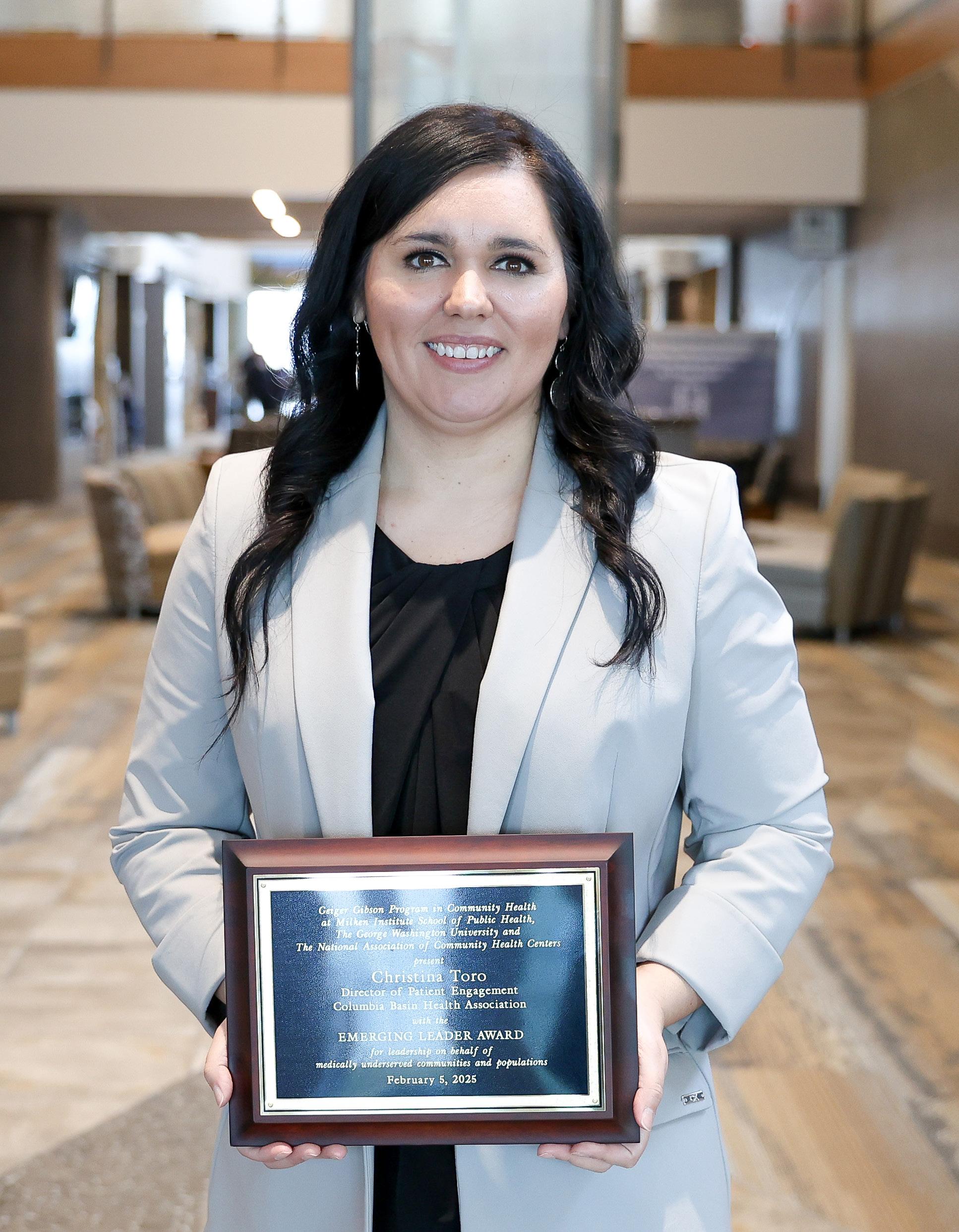 Christina Toro recibió el Premio Geiger Gibson al Líder Emergente, otorgado por el Programa Geiger Gibson de Políticas de Salud Comunitaria de la Escuela de Salud Pública del Instituto Milken de la Universidad George Washington. Este prestigioso premio, otorgado en colaboración con la Asociación Nacional de Centros de Salud Comunitarios (NACHC), reconoce a jóvenes profesionales que han impulsado significativamente la misión de los centros de salud comunitarios al garantizar una atención médica accesible y de calidad para las poblaciones marginadas.