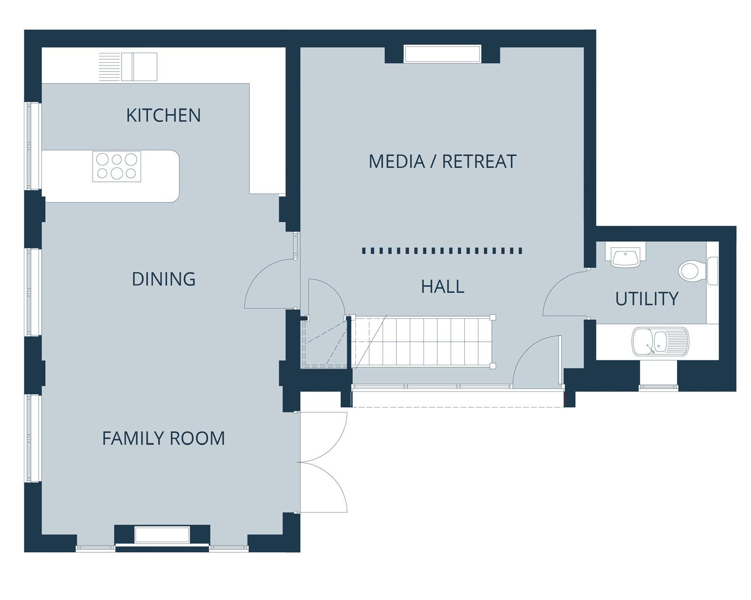 u Perfectly designed for modern living, the deceptively spacious ground floor of this beautiful home has a good-sized kitchen-dining area and a useful utility room, as well as a family room and a further reception room, an ideal space for a study or retreat. The practical outdoor amenity area provides space for car parking.