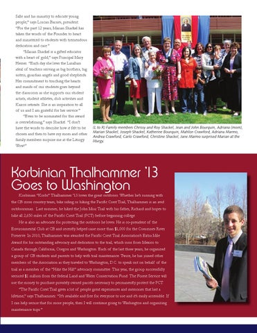 Environmental Club at CB and recently helped raise more than $1,000 for the Cosumnes River Preserve. In 2010, Thalhammer was awarded the Pacific Crest Trail Association’s Extra Mile Award for his outstanding advocacy and dedication to the trail, which runs from Mexico to Canada through California, Oregon and Washington. Each of the last three years, he organized a group of CB students and parents to help with trail maintenance. Twice, he has joined other members of the Association as they traveled to Washington, D.C. to speak out on behalf of the trail as a member of the “Hike the Hill” advocacy committee. This year, the group successfully secured $1 million from the federal Land and Water Conservation Fund. The Forest Service will use the money to purchase privately owned parcels necessary to permanently protect the PCT.