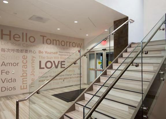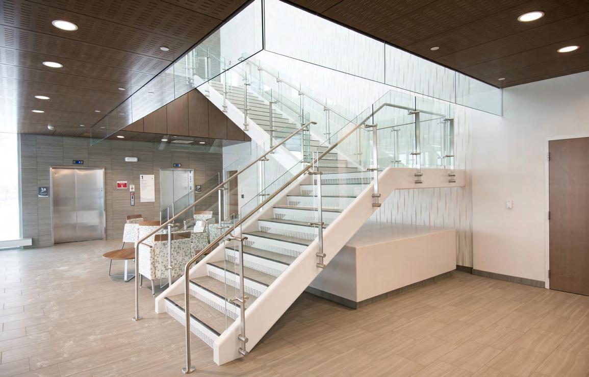The facility features separate, well-defined access for both the main entrance and urgent care. The main entrance atrium provides an open staircase and elevator lobby in abundant natural light. There is clear wayfinding for patients and visitors with perimeter paths which provide large floor to ceiling windows for natural light and exterior views. To provide more functional transit for staff, a “back of house” circulation was created to separate staff from patient flow. This provides more efficient staff access between urgent care, imaging and laboratories.