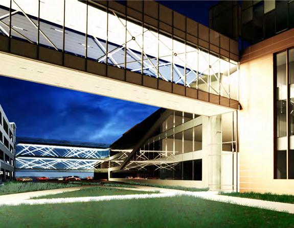 The new O&A building will be connected to the new inpatient hospital (Glick Center) via a first floor public connector and a third floor patient/staff elevated bridge connection for optimum efficiency. Anchor programs on the first and second floors include a 30,000 SF cancer center and a 10,000 SF breast center. These two programs will be displayed prominently thru the transparent first floor podium adjacent to the elongated drop off drive which will also serve the inpatient hospital. The exterior façade mimics the curtainwall proportions of the Glick Center at a smaller scale and changes in opacity to complement each interior functional component.