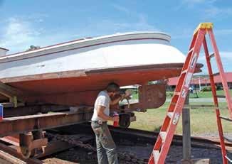 The crab dredger Old Point, built in 1909, was hauled and painted for her big 10-day trip to her home of Poquoson, VA. Shipwright appren tice Shane Elliot was attentive to detail during the process and proudly touched up her name on the bow before leaving for the Chesapeake Bay Buyboat Association’s annual cruise down the Chesapeake Bay.