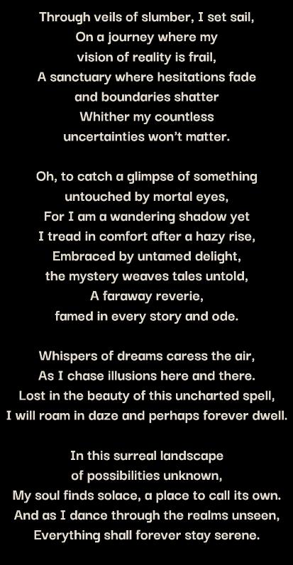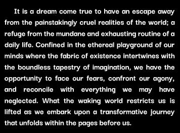 Welcome to this captivating literary folio of exploring the profound realm of dreams. Within these pages, you'll the profound realm of dreams. Within these pages, you'll embarkonamesmerizingjourneythroughoursubconscious embarkonamesmerizingjourneythroughoursubconscious landscapes, experiencing vivid visions, fleeting thoughts, landscapes, experiencing vivid visions, fleeting thoughts, and the evocative essence of our collective dreams. and the evocative essence of our collective dreams.