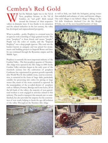 Porphyry is currently the most important industry of the Cembra Valley. . The first porphyry quarries of TrentinoAlto Adige were opened in the Alto Adige in 1880. In the Cembra Valley activities began in the early years of the twentieth century but the cultivation of porphyry Cembrano has experienced its greatest growth especially after World War II: this reddish stone, used in construction, is extracted in the form of large slabs, particularly suitable for processing into cubes for paving or large stones flat; much of the stone extracted is exported. In the municipalities of the so-called district of porphyry such as Albiano, Fornace, Baselga and Lona-Lases, all on the left bank of the valley), the majority of non-agricultural workers is now engaged in activities related to this industry. The need to transport this mineral, raw or semifinished, has also provided the impetus for the construction of new roads, helping to break the age-old isolation of the valley. Throughout the Trentino-Alto Adige