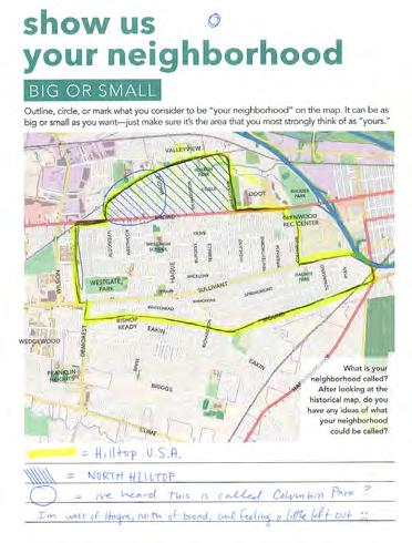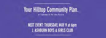 The following individuals donated their time, perspective, knowledge, and lived experience to the creation of the Hilltop Community Plan. The plan is based directly on their feedback and many of their responses are included in this document. This project owes much gratitude to their commitment and optimism!