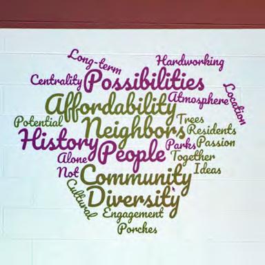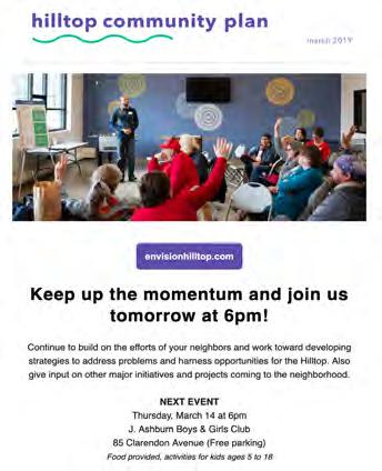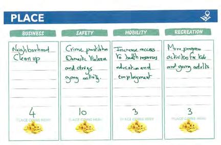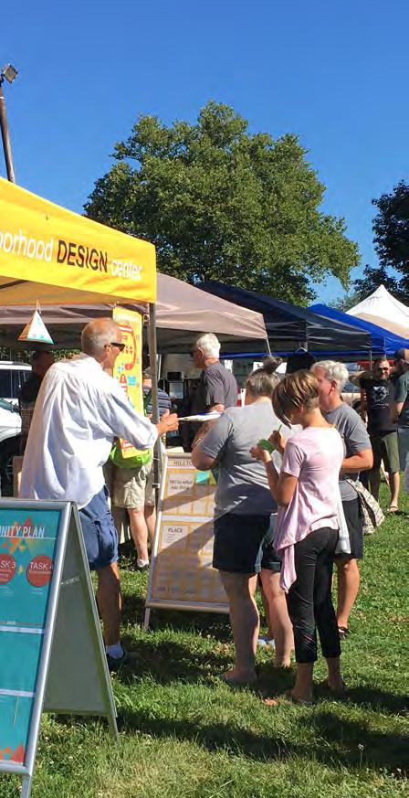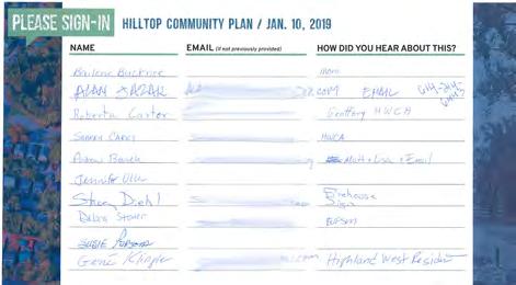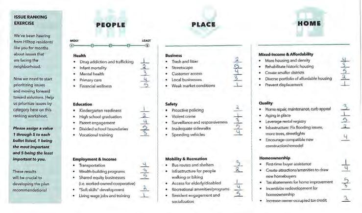 The Hilltop Community Plan public engagement process was driven by dedicated residents who met monthly to discuss problems and pursue solutions. The planning team designed exercises to solicit feedback and learn from the lived experiences of residents. The ideas represented in the plan were created either by residents themselves or in response to concerns voiced by residents over the year-long engagement period.