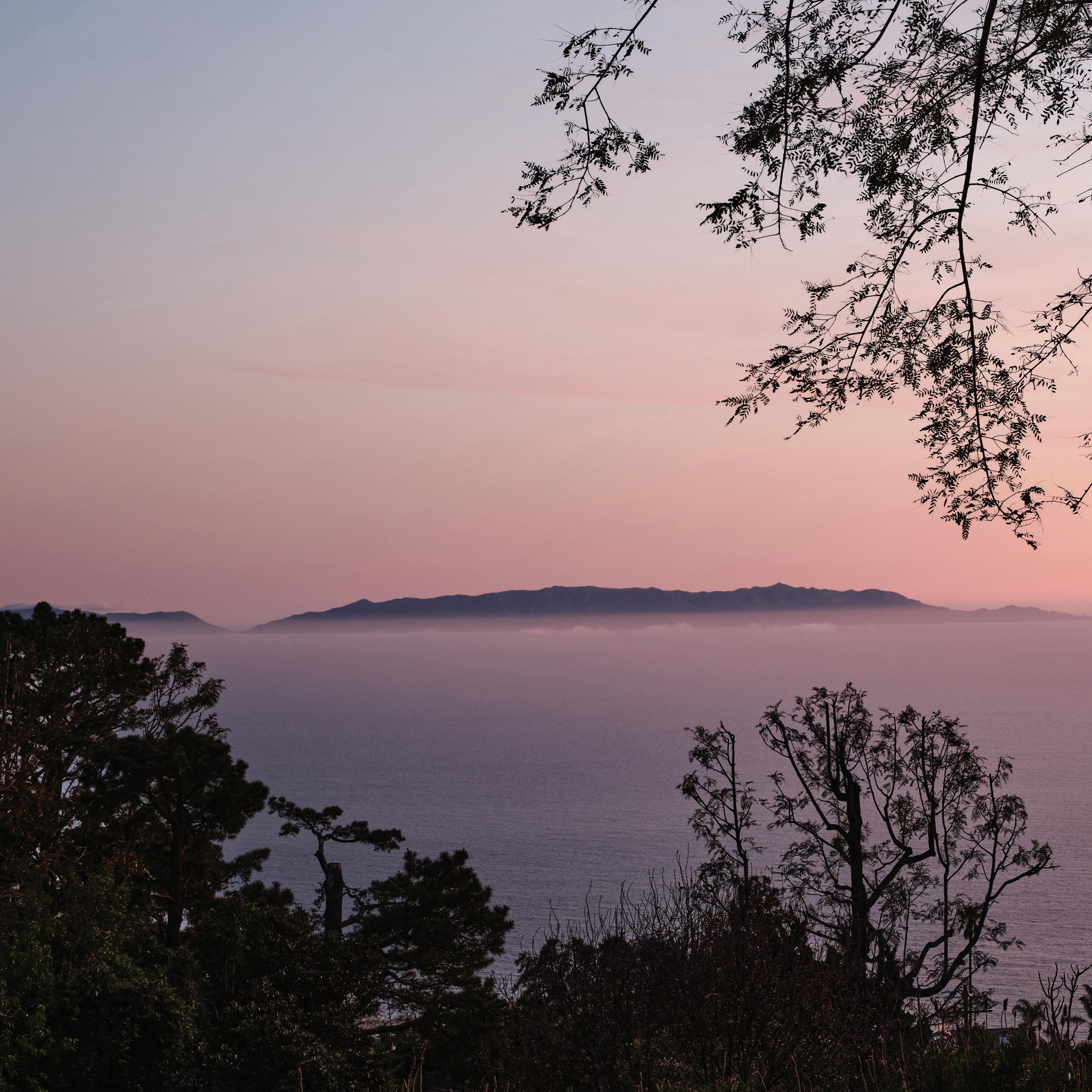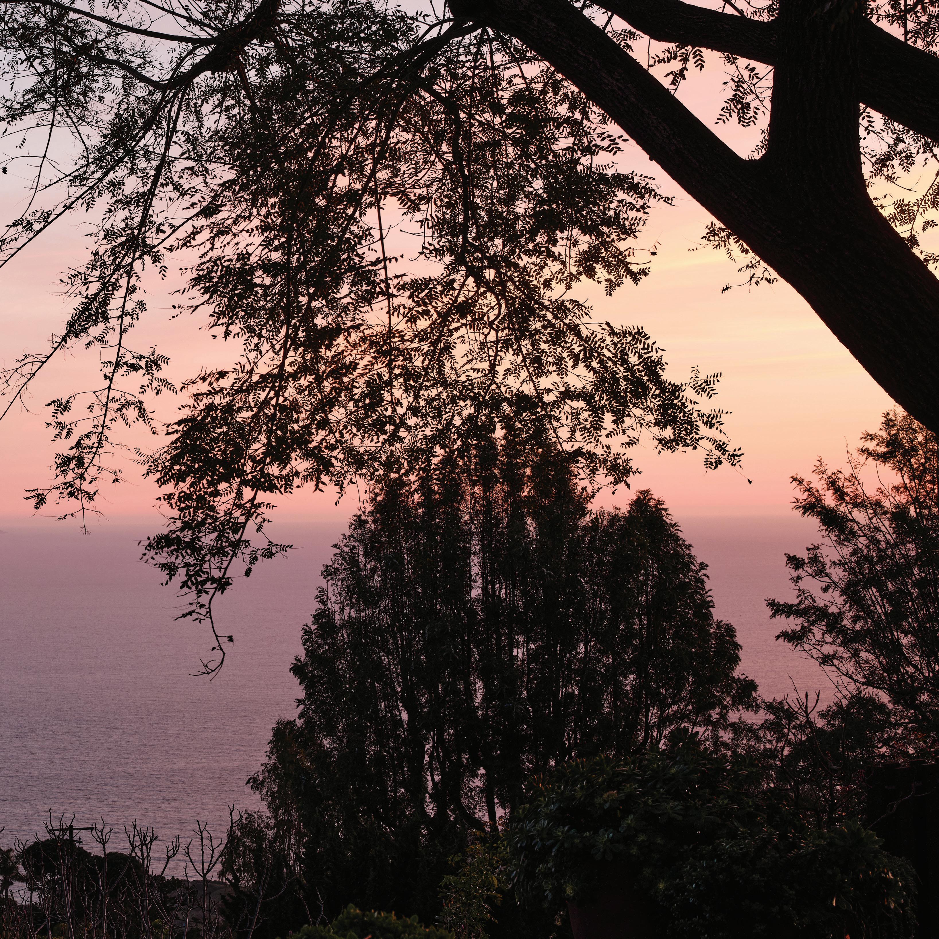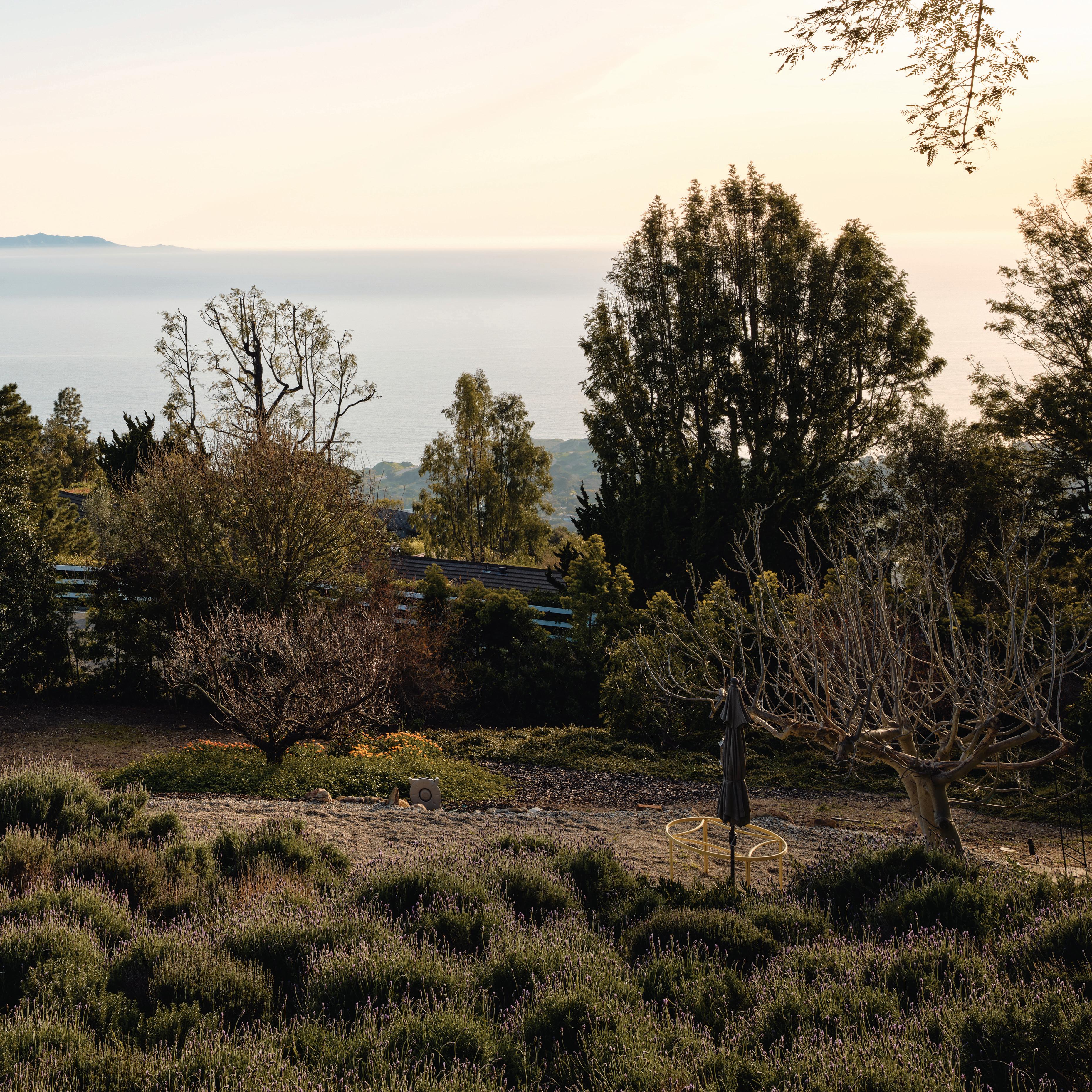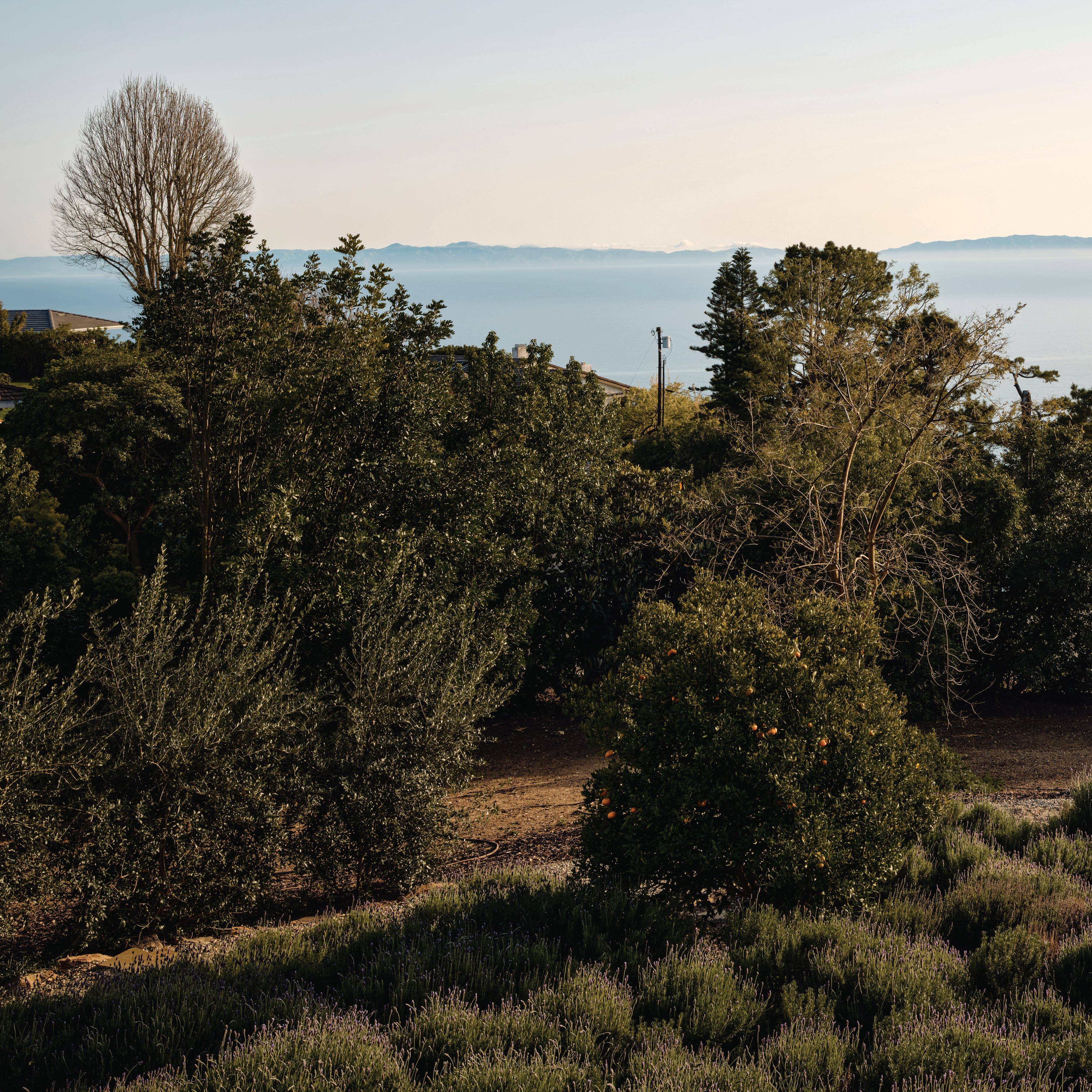 Boundless field of lavender and plentiful fruit trees float above the ocean vista.
