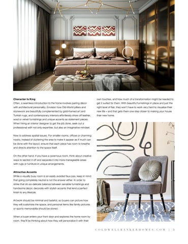 wool or velvet furnishings and unique accents as statement pieces. When hiring an interior designer to get the job done, seek out a professional with not only expertise, but also an imaginative mindset. Now to address spatial issues. For smaller rooms, offices or charming nooks, instead of cluttering the area to make it appear as if much can be done with the layout, ensure that each piece has room to breathe and directs attention to the space itself. On the other hand, if you have a cavernous room, think about creative ways to section it off and separate it into more manageable areas with rugs or furniture in unique arrangements. Attractive Accents While a visually busy room is an easily avoided faux pas, keep in mind that going completely neutral is not the answer either. In order to strike that oh-so-delicate balance between sensible furnishings and handsome décor, decorate with stylish accents that lend a perfect finish to any lifestyle. Artwork should be minimal and tasteful, so buyers can picture how they will customize the space, and personal items like family pictures or sports memorabilia should be stored. When a buyer enters your front door and explores the home room by room, they’ll be thinking about how they will personalize it with their C O L D W E L L B A N K E R H O M E S . C O M