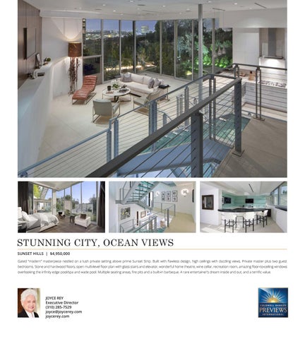 STUNNING CITY, OCEAN VIEWS SUNSET HILLS | $4,950,000 Gated “modern” masterpiece nestled on a lush private setting above prime Sunset Strip. Built with flawless design, high ceilings with dazzling views. Private master plus two guest bedrooms. Stone and hardwood floors, open multi-level floor plan with glass stairs and elevator, wonderful home theatre, wine cellar, recreation room, amazing floor-to-ceiling windows overlooking the infinity edge pool/spa and wade pool. Multiple seating areas, fire pits and a built-in barbeque. A rare entertainer’s dream inside and out, and a terrific value.