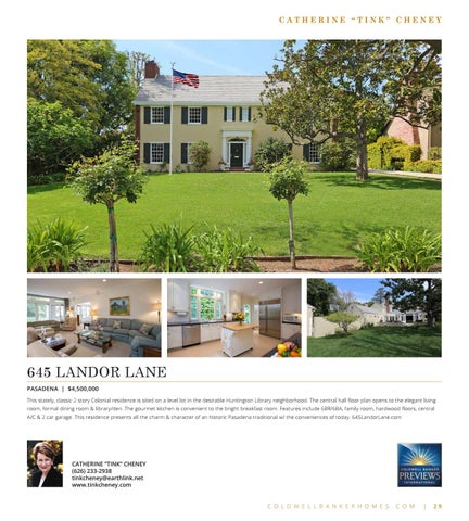645 LANDOR LANE PASADENA | $4,500,000 This stately, classic 2 story Colonial residence is sited on a level lot in the desirable Huntington Library neighborhood. The central hall floor plan opens to the elegant living room, formal dining room & library/den. The gourmet kitchen is convenient to the bright breakfast room. Features include 6BR/6BA, family room, hardwood floors, central A/C & 2 car garage. This residence presents all the charm & character of an historic Pasadena traditional w/ the conveniences of today. 645LandorLane.com