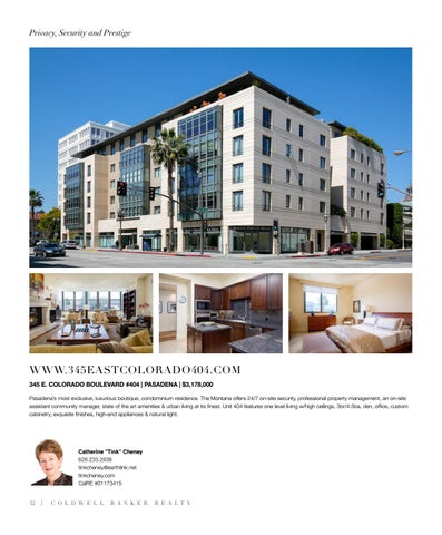 WWW.345EASTCOLORADO404.COM 345 E. COLORADO BOULEVARD #404 | PASADENA | $3,178,000 Pasadena’s most exclusive, luxurious boutique, condominium residence. The Montana offers 24/7 on-site security, professional property management, an on-site assistant community manager, state of the art amenities & urban living at its finest. Unit 404 features one level living w/high ceilings, 3br/4.5ba, den, office, custom cabinetry, exquisite finishes, high-end appliances & natural light.