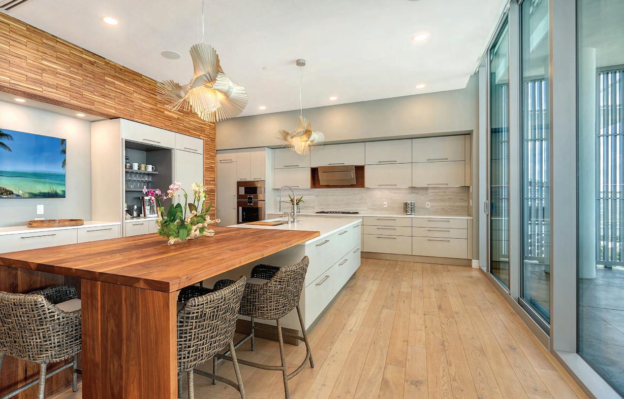 The gourmet kitchen boasts Gaggenau™ appliances including a 5-burner gas cooktop, quartz surfaces, a builtin coffee/juice station, Italian-made cabinetry, a custom walnut dining island and coordinating accent wall. Adjacent to the kitchen is a balcony with an electric outdoor grill, NatureKast™ cabinetry, granite countertops, beverage refrigerator, and an additional private dining area.