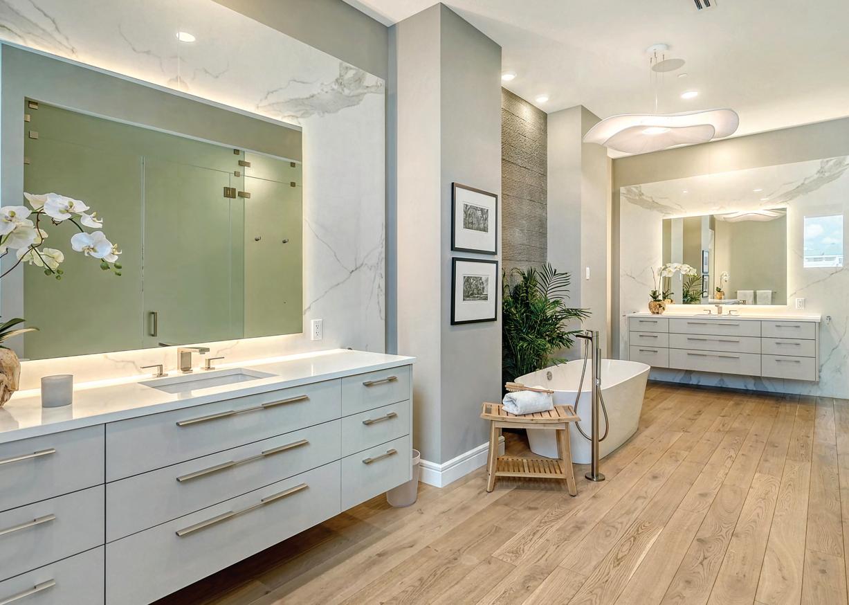 • Spa-inspired primary bath with large-format Neolith™ porcelain, dual water closets, and Toto™ one-piece comfort commodes