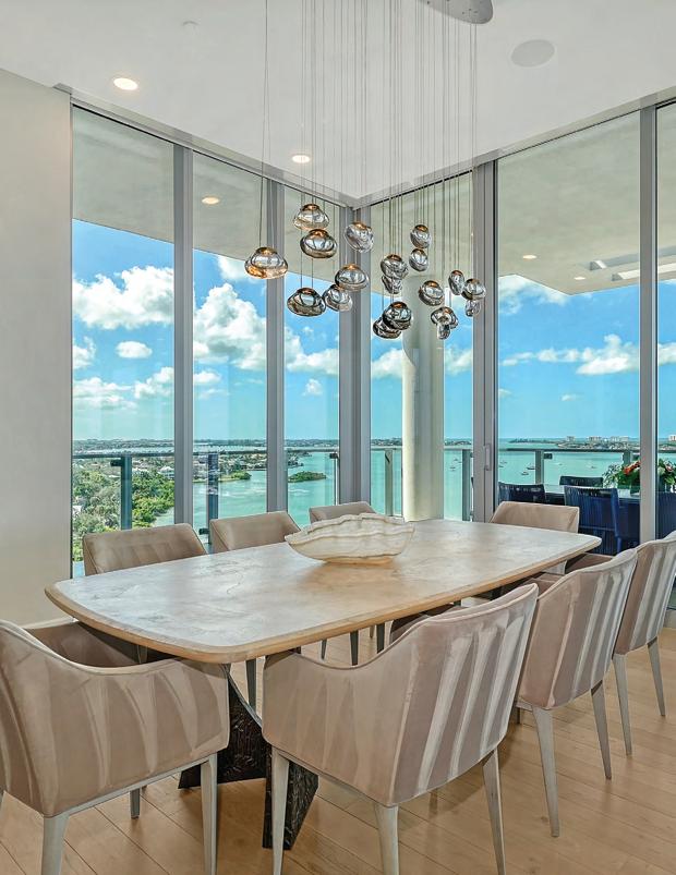 This twelfth-floor masterpiece, built in 2021, offers the entire floor, over 5,600 square feet of interior space and nearly 2,000 square feet of wraparound terraces to enjoy the panoramic views and spectacular sunsets on Sarasota Bay and the Gulf. The custom-design blends the highest level of craftsmanship with secure enhanced hurricane construction, featuring custom floor-to-ceiling 11.5-foot impact sliders that offer breathtaking views like no other, with seamless indoor-outdoor living and peace of mind.