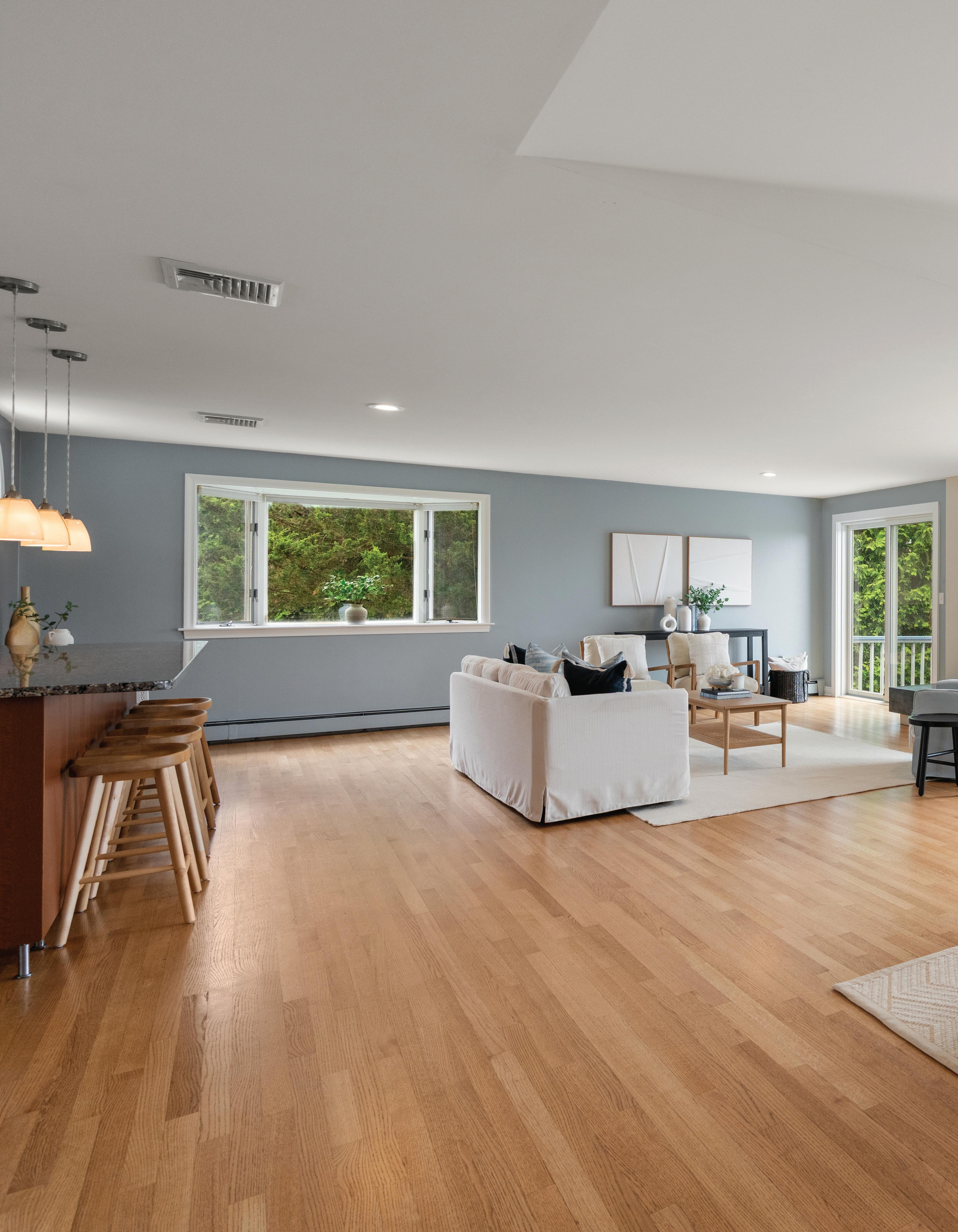 Set above Almy Creek with sweeping panoramic views of the Sakonnet River, this thoughtfully updated ranch offers a seamless blend of comfort and style. The sunlit open floor plan is highlighted by the captivating westerly water views. boasting gleaming hardwood floors, a soft, coastal-inspired color palette, and a charming wood-burning fireplace. The kitchen features stainless steel appliances, ample cabinet space, and a breakfast bar that flows effortlessly into the living and dining areas and sliding glass doors to the deck. Just off the main living are two bedrooms and a full bath, including a serene primary bedroom with direct deck access. The walkout lower level expands the living space with a third bedroom, second full bath, workshop, and a versatile area ideal for a guest suite, office, or playroom. A one-car garage provides direct access to a functional mudroom and laundry area, connecting conveniently to the kitchen. Outside, enjoy an expansive west facing deck with stunning water views, terraced grounds with mature landscaping, perennial gardens, a storage shed, and a private outdoor shower. Embrace the best of coastal New England living, with ever-changing seasonal beauty and unforgettable sunsets at 55 West Main Road.