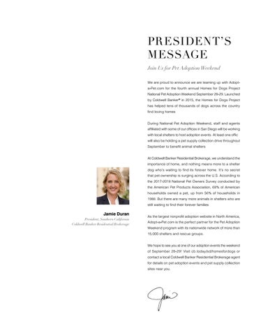 PRESIDENT’S MESSAGE Join Us for Pet Adoption Weekend We are proud to announce we are teaming up with Adopta-Pet.com for the fourth annual Homes for Dogs Project National Pet Adoption Weekend September 28-29. Launched by Coldwell Banker® in 2015, the Homes for Dogs Project has helped tens of thousands of dogs across the country find loving homes During National Pet Adoption Weekend, staff and agents affiliated with some of our offices in San Diego will be working with local shelters to host adoption events. At least one offic will also be holding a pet supply collection drive throughout September to benefit animal shelters At Coldwell Banker Residential Brokerage, we understand the importance of home, and nothing means more to a shelter dog who’s waiting to find its forever home. It’s no secret that pet ownership is surging across the U.S. According to the 2017-2018 National Pet Owners Survey conducted by the American Pet Products Association, 68% of American households owned a pet, up from 56% of households in 1988. But there are many more animals in shelters who are still waiting to find their forever families
