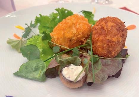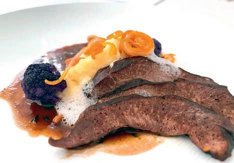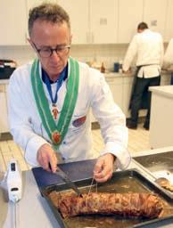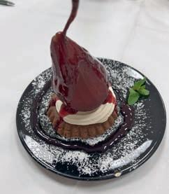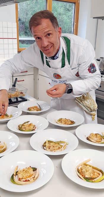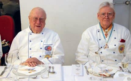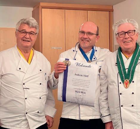 Zeitablauf, die Präsentationen, Deko, Weine und die Versorgung seiner Kochbrüder perfekt vorbereitet waren. Davon konnten sich die Juroren LK und CL GMdC Jean-Claude Fourcade, CL GMdC Hans Arnold und CL GMdC Peter Gottbrhüt an diesem Abend überzeugen. Roman verwöhnte uns mit: z Maroni und Trockenpflaumen im Speckmantel auf Rosmarinspieß (dekoriert auf Ahornblättern, die bereits im Herbst gesammelt und getrocknet wurden). Dazu wurde ein Weißburgunder-Sekt, Anton Finkenauer, Bad Kreuznach, serviert. Ein optisch und inhaltlich hervorragender Einstieg. Danach folgten: z Rosenkohlsüppchen mit Karottenstroh Riesling/ Sauvignon blanc, Dr. Gänz, Nahe z Rote Bete-Risotto mit Walnüssen – Spätburgunder Rosé, Lindenhof, Nahe z Wirsingroulade vom Kabeljau mit Kartoffel-Mousseline und Beurre blanc (Prüfungsgang) – Weißer Burgunder, Anton Finkenauer, Bad Kreuznach z Rotwildfilet mit Rosinen-Pfeffersauce und Apfel-Möhrensalat (Prüfungsgang) – Spätburgunder, Lindenhof, Nahe z Tartelettes mit Rotweinbirne und Baiser –Riesling Auslese, Anton Finkenauer, Bad Kreuznach