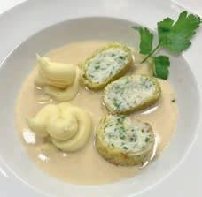 beln knusprig gebraten. Alles wurde mit Semmelbröseln gebunden, zu Nocken geformt, mit Pankomehl paniert und goldgelb frittiert auf einem pikanten Wildkräutersalat mit Champignon-Apfel-Dressing serviert. Eine außergewöhnliche Köstlichkeit. Anschließend wurde eine 'Suppe nach thailändischer Art' gereicht, die durch ihre ätherischen Zutaten und einer Vielfalt von säuerlichen und zwiebeligen Nuancen überraschte. Neben geschnittenen Kalbskutteln wurden Chilis, Schalotten, Ingwer, Galgant, Zitronengras, Limettenblätter, Tamarindsoße gekocht, mit Fischsoße und Austernsoße abgeschmeckt und mit Koriander garniert. Überraschend lecker.
