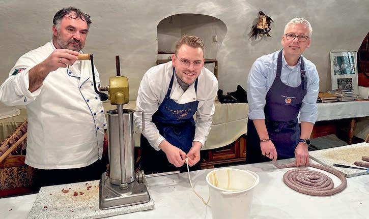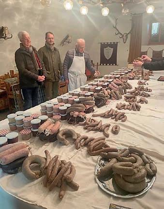 Auf der Agenda für den Samstag standen Blut- und Leberwurst sowie Schwartenmagen und dreierlei Grillwurst (grobe Bratwurst vom Haus- und Wildschwein sowie eine „Kirmesbratwurst“ mit zahlreichen Kräutern und Gewürzen sowie einer ansprechenden Zitrusnote). Die in den Morgenstunden begonnenen Arbeiten wurden gegen 10:00 Uhr von einem kräftigen Frühstück unterbrochen, bei dem selbstgemachtes Mett sowie Hausgemachtes von den Kochbrüdern Herbert Kolb GMdC und Tino Hahn CdC verkostet wurde. So gestärkt wurde bis zur Mittagszeit weitergearbeitet und sodann ein ebenfalls von Herbert Kolb vorzüglich zubereiteter Pfälzer Saumagen sowie Welllfleisch, Nieren und der berühmte „Schwarze Brei“ von CL und LK Dr. Herbert Geipert GMdC mit Kartoffelstampf und Sauerkraut verspeist. Am Nachmittag erfreute dann noch der obligatorische Nibelungenkuchen den Gaumen, bevor die Münsteraner den Weg zurück ins Hotel antraten, wo das tagsüber geleistete abends noch ge-