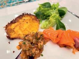 Der Zwischengang bestand aus ‚Lachsvariationen mit Kartoffelpuffer‘. Der vorbereitete hausgebeizte Lachs wurde in dünnen Scheiben auf dem Teller angerichtet. Dazu war ein Lachstatar aus kalt gegarten Lachswürfeln drapiert und mit etwas selbst hergestellter Honig-Dillsauce ergänzt. Zwei kross gebratene Kartoffelpuffer aus geriebenen rohen Kartoffeln vervollständigten mit einer kleinen Salatgarnitur den Teller. Im Mund ergab sich ein sehr angenehmes Zusammenspiel der fein abgestimmten Lachsvarianten, den noch warmen Kartoffelpuffern und der süßlich-pikanten Soße. Ein wahrer Genuss.