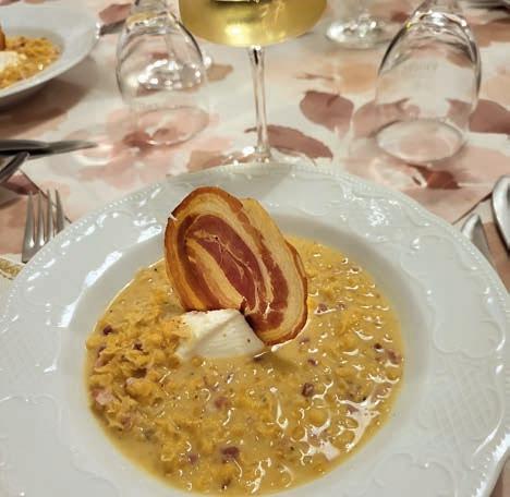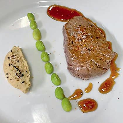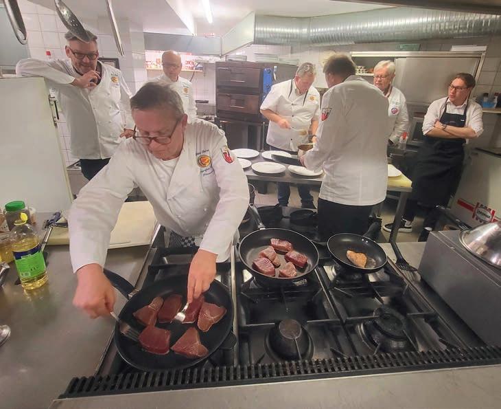 z Eiscreme als Vorspeise – das hat es sicher noch nicht oft gegeben bei einer offiziellen Kochprüfung zum CdC in unserem Club kochender Männer. Aber andererseits war die Nürnberger Turmchuchi auch noch nie eine Truppe, die sich groß darum geschert hat, was „üblich“ oder „richtig“ ist. Eines steht jedenfalls fest: mit diesem Gang zeigte Kochprüfl ing Raimondo Sanna den anwesenden Prüfern und Kochbrüdern schon eindrucksvoll die Richtung, in die es bei seiner Kochprüfung gehen sollte. Und geschmeckt hat der Gang, Parmesaneis mit Serrano-Chip auf Weintrauben, die mit Pistazienkernen mariniert waren, auf jeden Fall allen.
