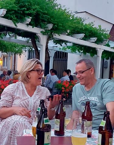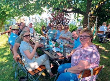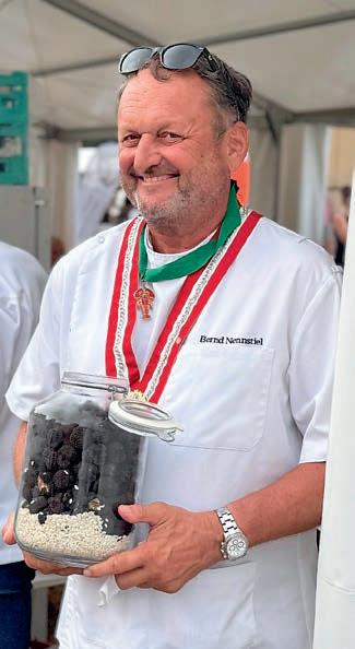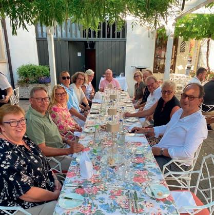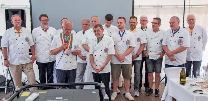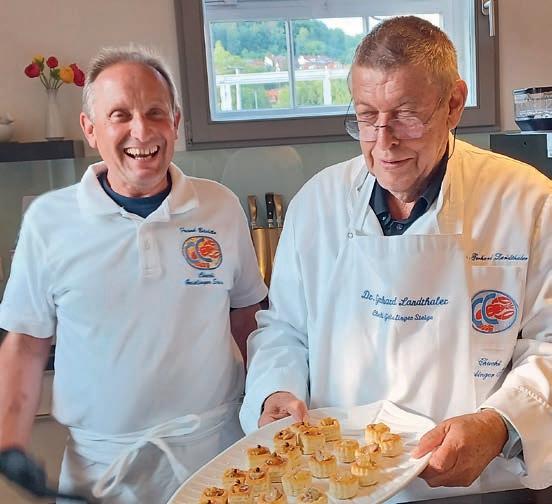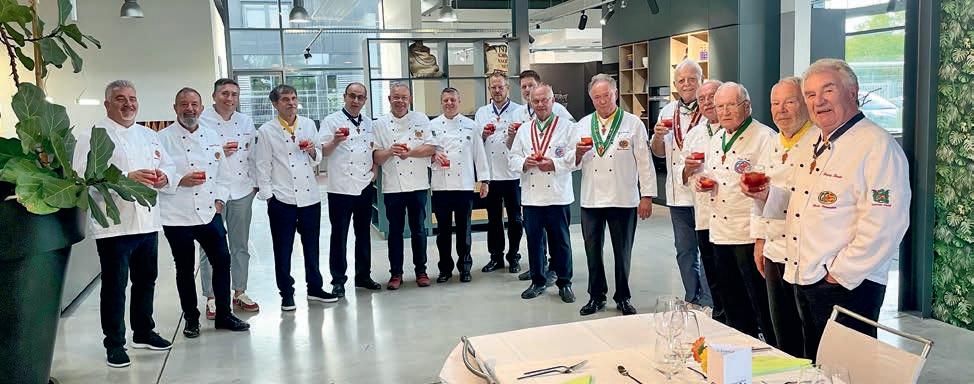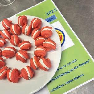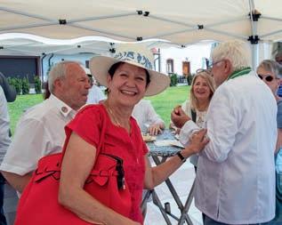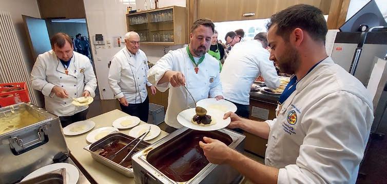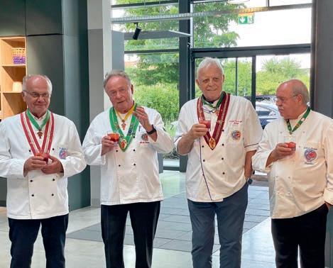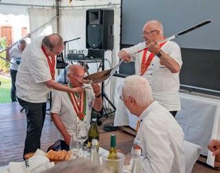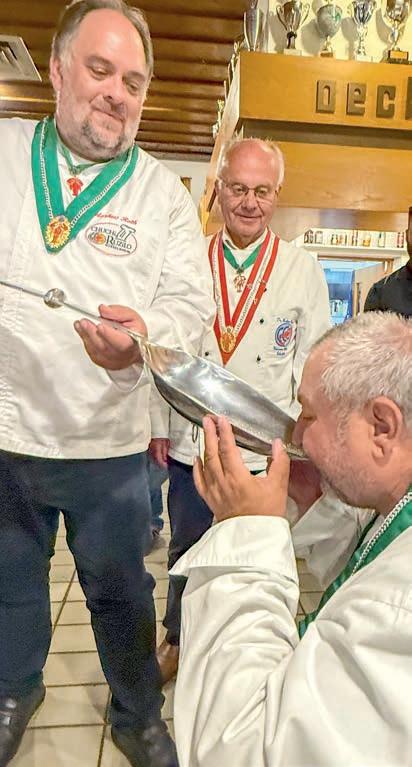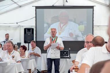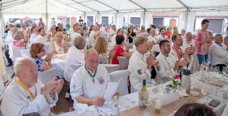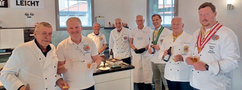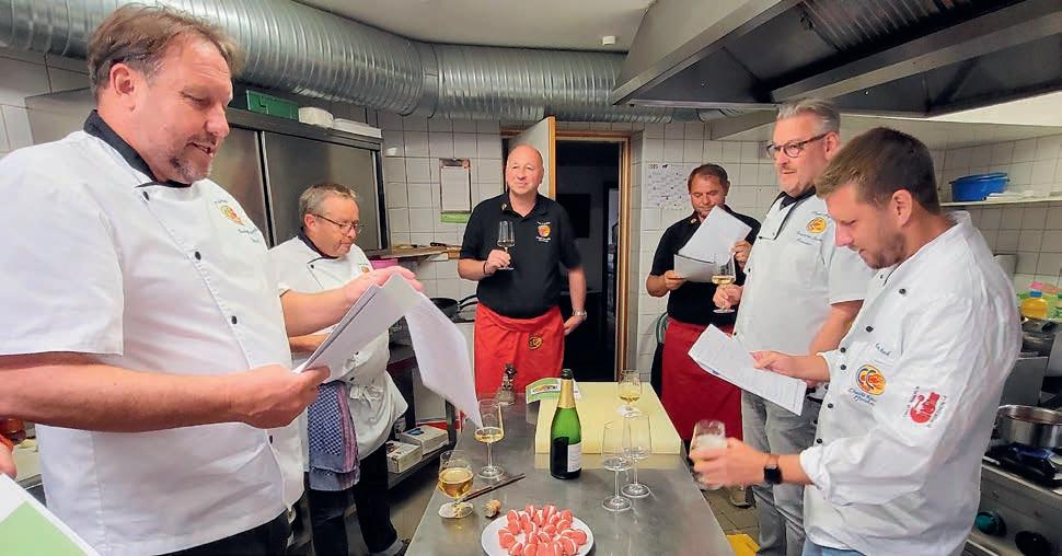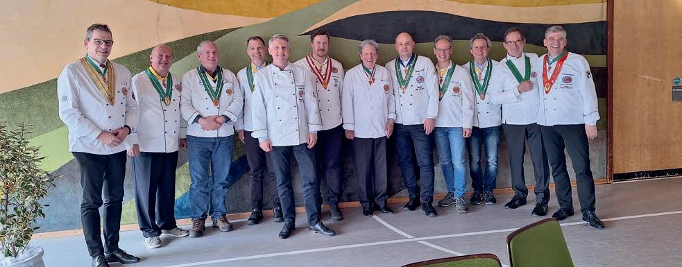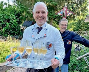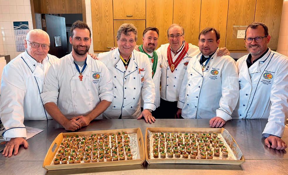 z Ein halbes Jahrhundert Kochkunst, Geselligkeit und gelebte Tradition – am 14. Juni 2025 feierte die Nibelungen-Chuchi Biebesheim ihr 50-jähriges Bestehen. Gleichzeitig wurde das Ordensprovinzfest der Region Rhein-Main ausgerichtet. Ein doppelter Anlass zum Feiern, Genießen und Erinnern. Zur zuverlässigen Finanzierung des Provinzfestes leistet jeder Kochbruder einen Beitrag von 30 € (unabhängig von seiner Teilnahme), zudem fl ießt der gesamte Landeskanzlerzuschuss in die Veranstaltung. Diese provinzspezifi sche Regelung ermöglicht es, das Fest Jahr für Jahr unter der Verantwortung wechselnder Chuchis auszurichten. Auch in diesem Jahr folgten Kochbrüder und Kochschwägerinnen aller zwölf Chuchis der Einladung – darunter sechs Brüder aus Münster in Westfalen. Ihre tatkräftige Unterstützung bewies die enge, freundschaftliche Verbundenheit mit der Nibelungen-Chuchi Biebesheim. Insgesamt kamen 120 Gäste auf das Hofgut Wasserbiblos, das seit über 40 Jahren Wirkungsstätte der Biebesheimer Chuchi ist. Ein Fest dieser Größenordnung verlangte exakte Planung und zahlreiche helfende Hände. Dank der sorgfältigen Organisation von Landeskanzler und Chuchileiter Herbert Geipert GMdC verwandelte sich das Hofgelände in eine festliche Kulisse mit Festzelt, separater Anrichtezone und liebevoll dekorierten Tafeln. Der Tag begann ganz bodenständig mit „Weck, Worscht un Woi“, serviert von der Chuchi Münster, gefolgt von drei spannenden Ausflügen –etwa zu den Nibelungenhof-Kräutern, zur Kompostierungsanlage mit Forschungsreaktor oder ins Hofgut Guntershausen auf dem Kühkopf. Am Nachmittag kehrten alle zum Hofgut zurück, wo feine Quiches, erfrischende Getränke und kühler Ingwer-Spitz gereicht wurden – bevor der festliche Abend begann. An elegant eingedeckten Tischen erwartete die Gäste ein Menü, das nicht nur kulinarisch, sondern auch organisatorisch seinesgleichen suchte.