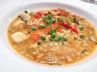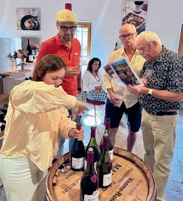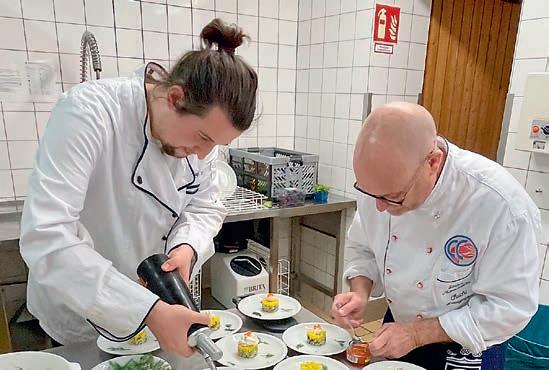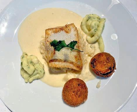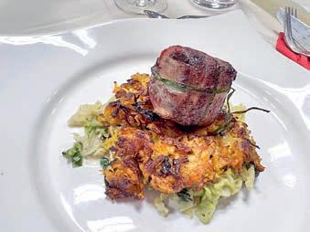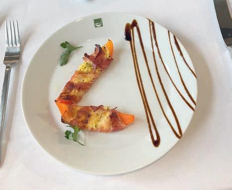 Im nächsten Gericht, einer spanischen Fischsuppe, wurde der Fisch ergänzt durch typisch spanische Zutaten wie Paprika, Tomaten, Zwiebeln, Reis und einer Vielzahl von Kräutern. Eine gelungene sommerliche Kombination, die allerdings noch etwas mehr Würze hätte vertragen können. Dazu gut passend Vin Rosé La Coquette 2022. Mit dem folgenden Hauptgang und gleichzeitig zweitem Prüfungsgang führte uns Alexander in heimatliche, saarländische Gefi lde: Blutwurst im Speckmantel mit Kürbis- Dibbelappe und Rahmwirsing. Für alle, die das saarländische Nationalgericht nicht kennen: Dibbelappe(s) ist eine Art Kartoffelpfannekuchen mit Lauch und Speck, hier in einer Variante mit Kürbis, was den herz-