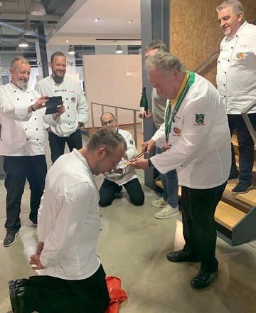 so begrüßte Ralf Röder zu seinem Rangerhebungskochen zum Maître de Chuchi seine Kochbrüder und die Jury, bestehend aus Thomas Schmidhuber, MD, GMdC, Wolfgang Vogelgesang, GMdC, Landeskanzler der Ordensprovinz Mosel–Saar–Wasgau und dem stellvertretenden Landeskanzler Peter Schwarz, GMdC.