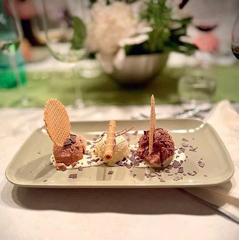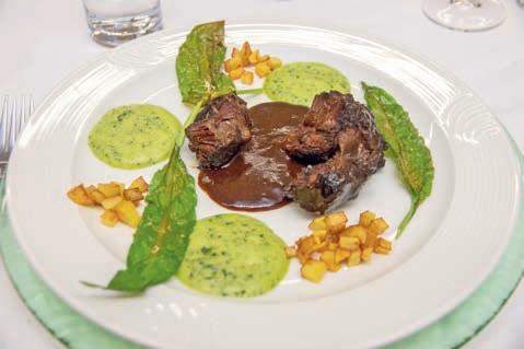 z Sorbet „Eisiger Frühling“ mit Kräutern, Traubensaft und Sekt frisch, kräuterig ein frühlingshafter Gaumenputzer z Geschmorte Kalbsbacke mit Bärlauch-Espuma und Kartoffelwürfeln Butterzart geschmort, begleitet von einer tiefgründigen Rotweinsauce und knusprigen Kartoffelwürfeln. Das feine Bärlauch-Espuma sowie kurz sautierte Bärlauchblätter setzten aromatische Akzente. Ein Gericht mit Tiefe und Eleganz.