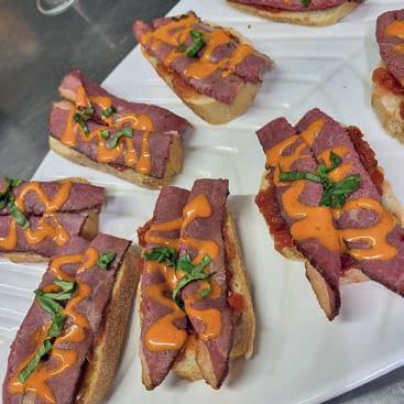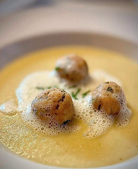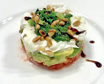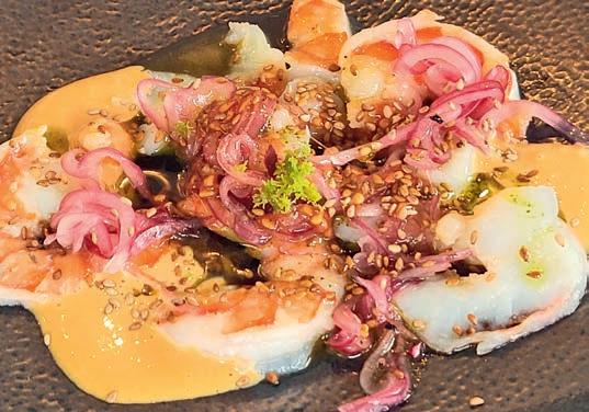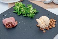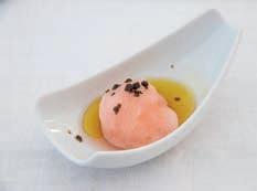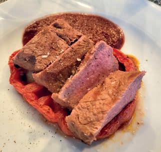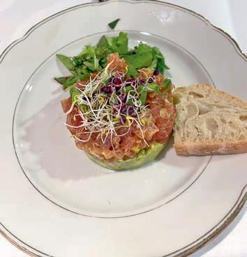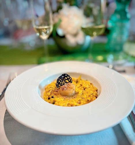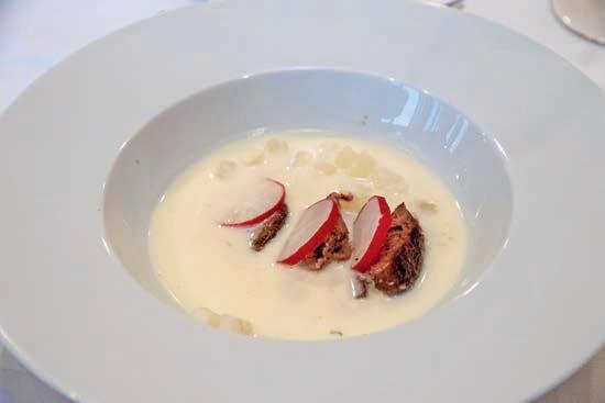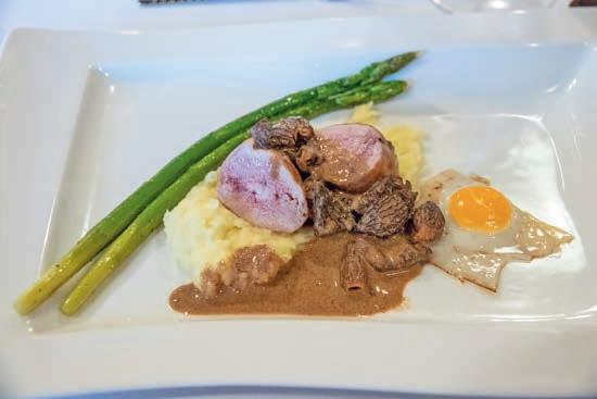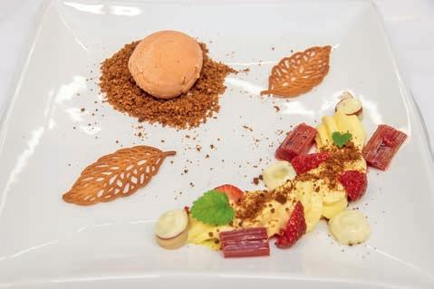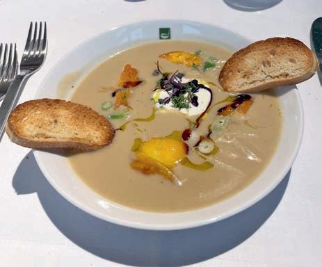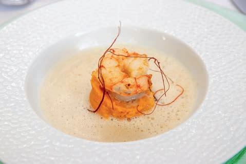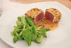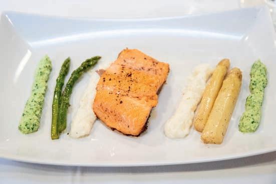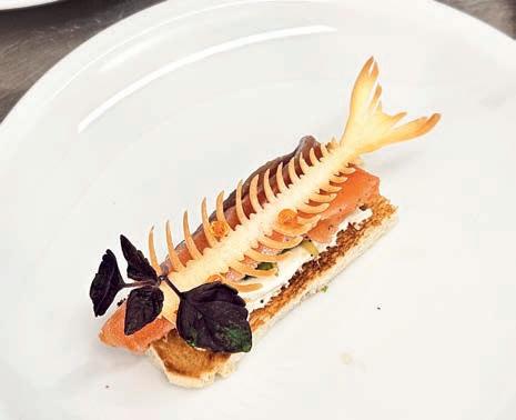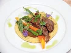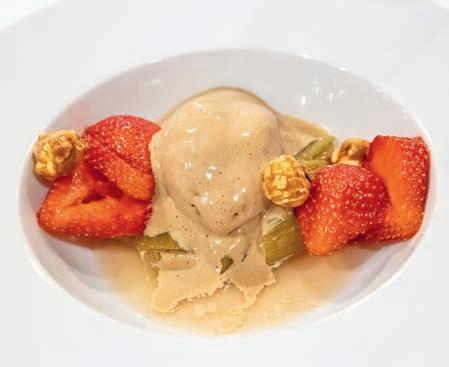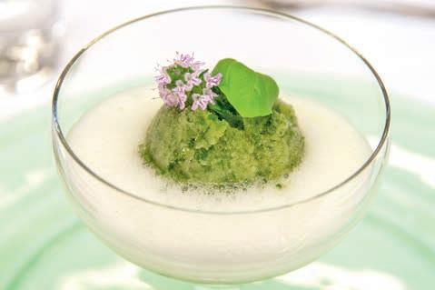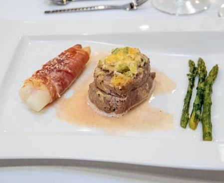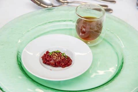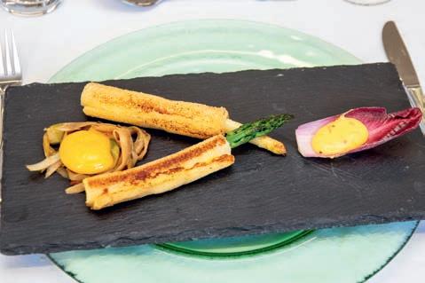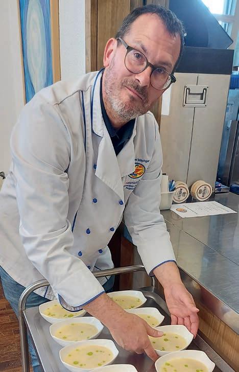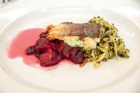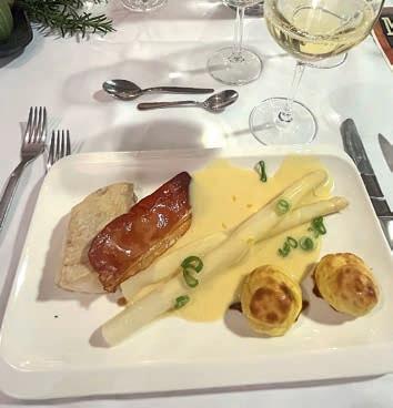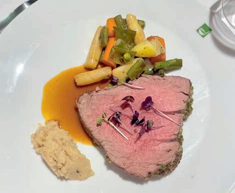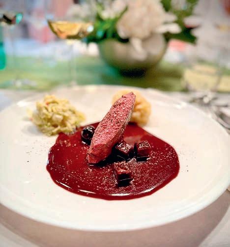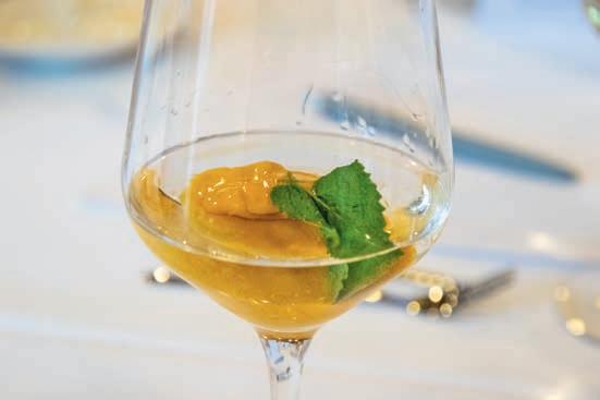 Thunfi sch in Kräuterkruste auf Honig-Senf-Sauce eröffnete den Reigen. Es folgten Highlights wie marinierter Tafelspitz mit Meerretticheis, eine samtige Spargelcremesuppe mit Orangenöl sowie ein Grapefruitsorbet mit fermentiertem Pfeffer und Olivenöl als aromatischer Zwischengang.
