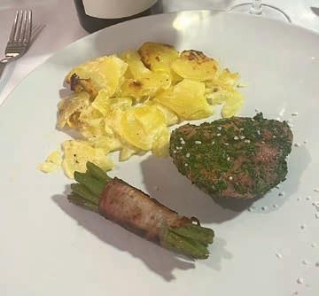 z Aperitif: Riesling Prestige Cuvee brut, ökologisches Weingut Sander, Mettenheim z Thunfischtatar auf Avocado India Pale Ale, Privat-Brauerei Sander z Kabeljau Loins, Spargel, Herzogin Kartoffel, Beurre blanc Magnum Savignon blanc 2023, z Apfel-Birnen Sorbet mit Williams Christ z Kalbsfilet im Kräutermantel, in Pergamentpapier gegart, Kartoffelgratin, Speckbohnen Weißburgunder Michelsberg 2023, trocken z Mousse au Chocolat auf Dialog der Früchte Riesling Beerenausles 2015