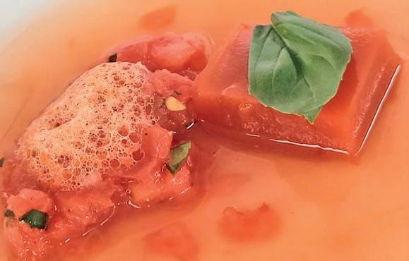 Nach diesen beiden Küchengrüßen wurde eine Tomatenessenz mit T.gelee, T.tartar und T. schaum komponiert, gefolgt von einem Garnelen-Carpaccio mit Yuzu, Sesam, gepickleten T.kernen, T.mayonnaise und Korianderöl. Es folgte T.risotto und Gewürzcrunch mit confiertem Saibling. Dann Lammrücken mit T.fondant, geschmorter Ochsenherztomate und T.reduktion. Und wer denkt, jetzt aber ist’s mit der Paradeiserei genug, nein! Das Dessert bestand aus Tomaten-Erdbeer-Sorbet mit Minzgel und Balsamicoperlen.