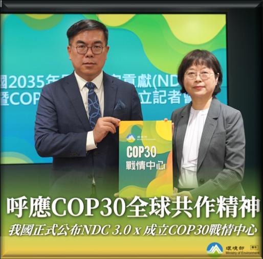 • 我國與國際同步提出NDC3.0、推動實施碳定價、積極落實氣候變 遷調適及各項氣候行動,也持續加強國際合作,期與各國集體行動 擴大落實「巴黎協定」,共同為全球淨零與永續發展貢獻臺灣力量。