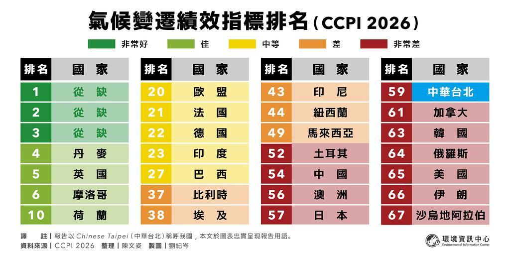 • 德國看守協會與歐洲氣候行動網公布CCPI 2026評比結果,與國際具代表性的減碳統計結果差 異甚大,評比結果不合理,難以反映真實減碳表現。