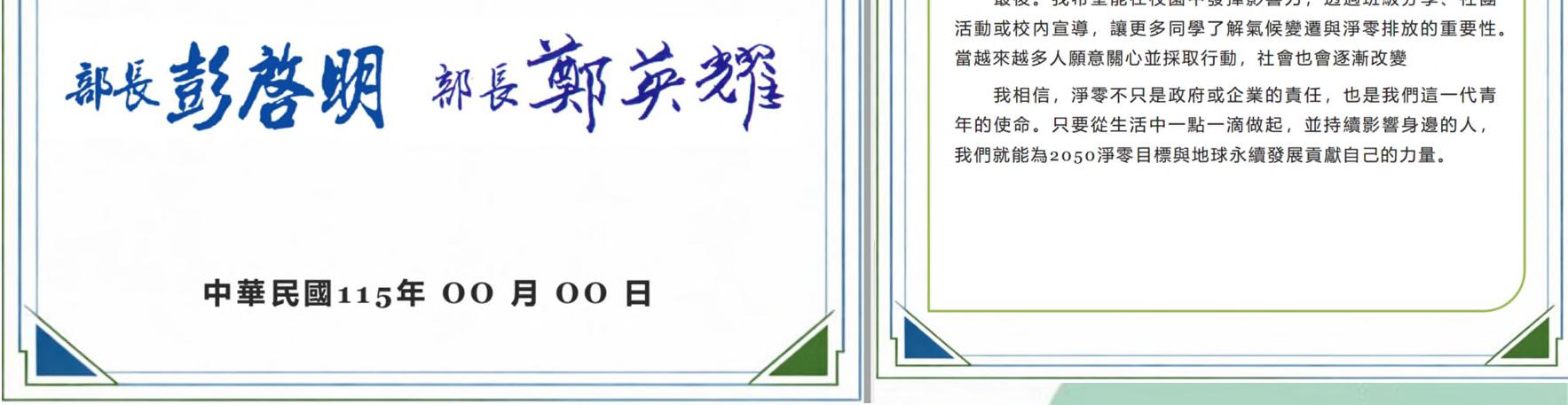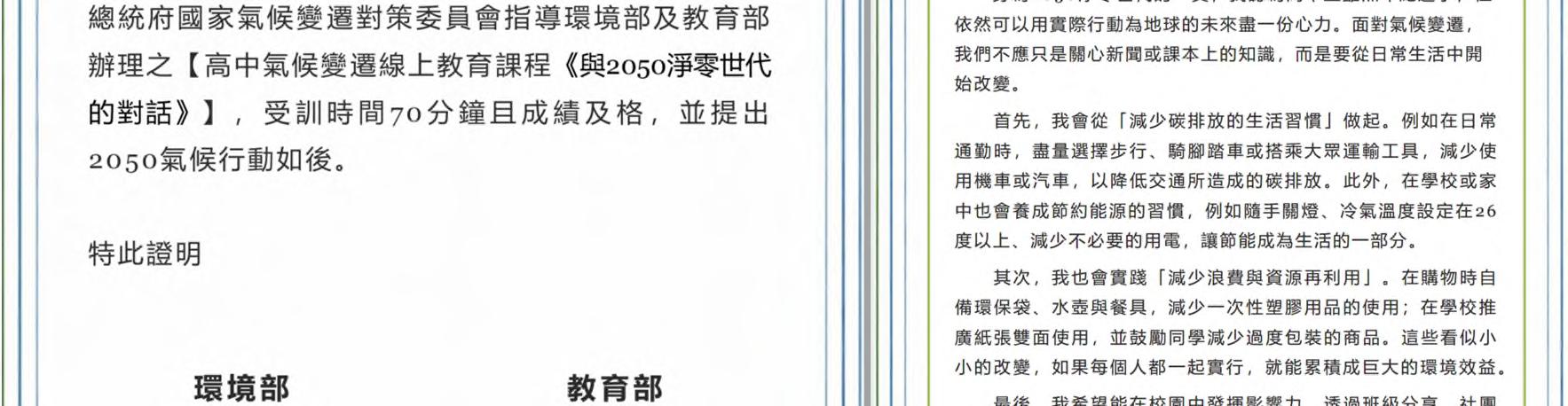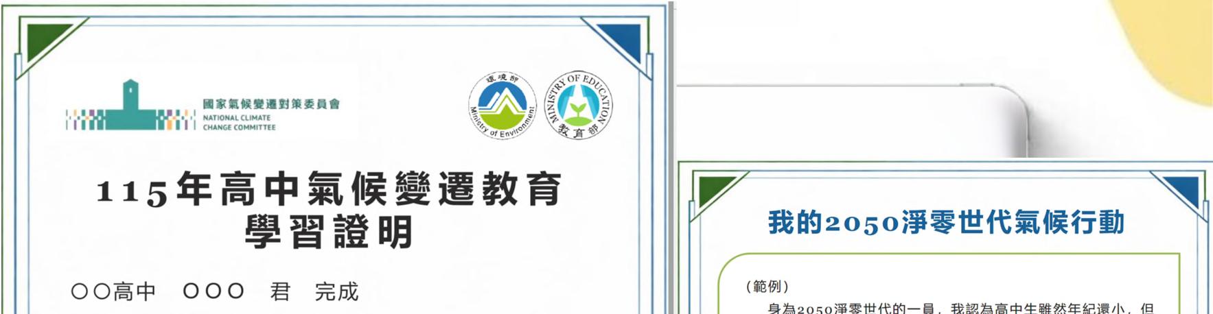 高中專屬學習證明 with環境部+教育部雙部⻑ 證明上將具體呈現學生專屬的 「我的2050淨零世代氣候行動」