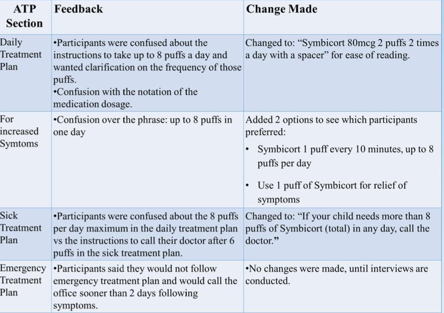 Caregivers of children with asthma were approached in waiting rooms of primary care clinics in Hartford, CT. Participants were presented the ATP and probed with questions to assess their understanding. Demographic data was collected. Iterative rounds of field-testing and a final focus group were used to recognize, categorize, and contextualize major themes.