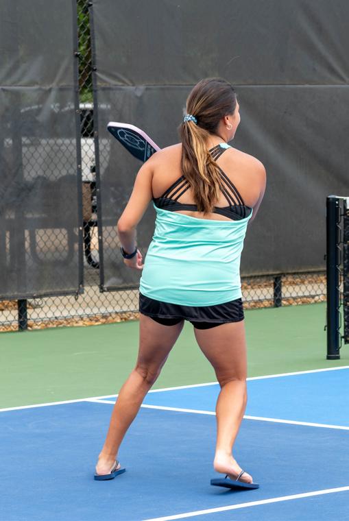 Photos below capture the fun of the “Beat the Pro” pickleball challenge, where the pro gave players a fighting chance by competing in flip-flops and with a frying pan!