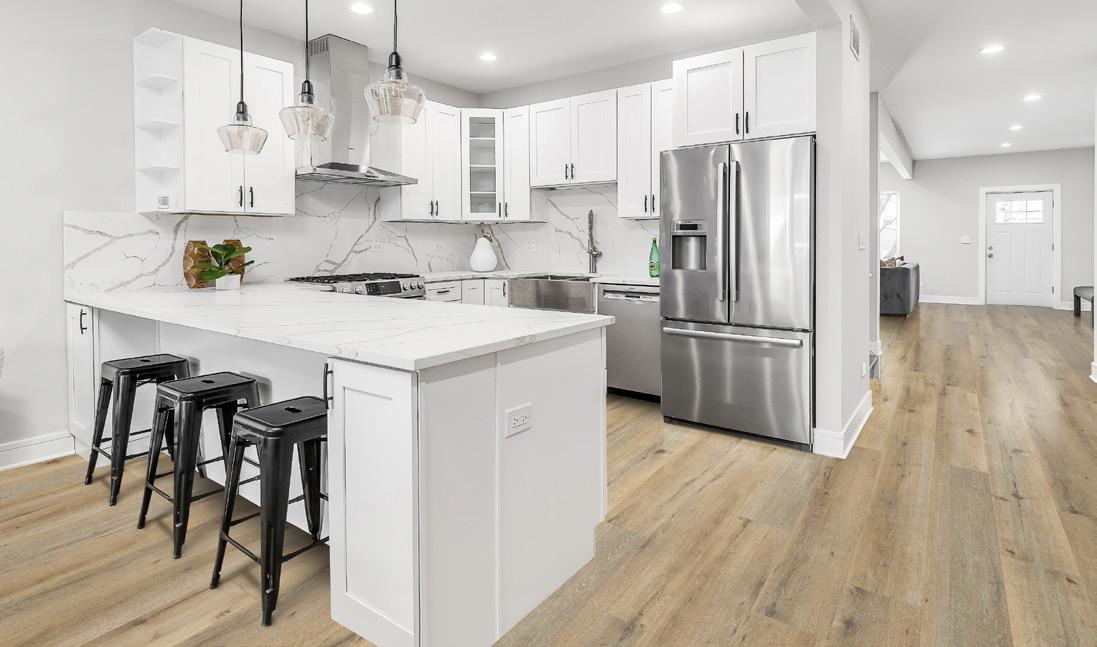 3/8” engineered white oak, 6.38” x rdm up to 58.56”, Repel water Resist, wire brushed, micro bevel