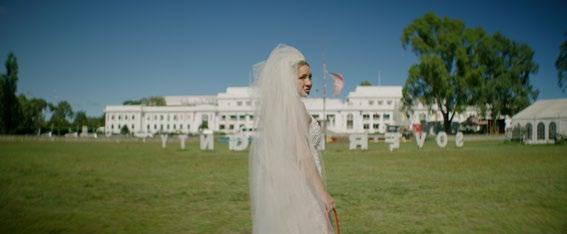 Through cinematic editing and visual trickery, Groom disappears and reappears across this landscape, connected always by the red rope. The Bride’s movements become a loop—ritualistic, exhausting, and unresolved. Each iteration of the journey brings her to the gates of Parliament House, but each time she is cast back to where she began. This cyclical temporality—what might be called a sovereign time—echoes Indigenous understandings of time as nonlinear, as continuous presence. In this, The Lodge becomes a spiritual enactment of both repetition and transformation. The Bride is caught in a war not just of politics, but of metaphysics—a struggle between sovereign cosmologies and colonial illusions of permanence.
