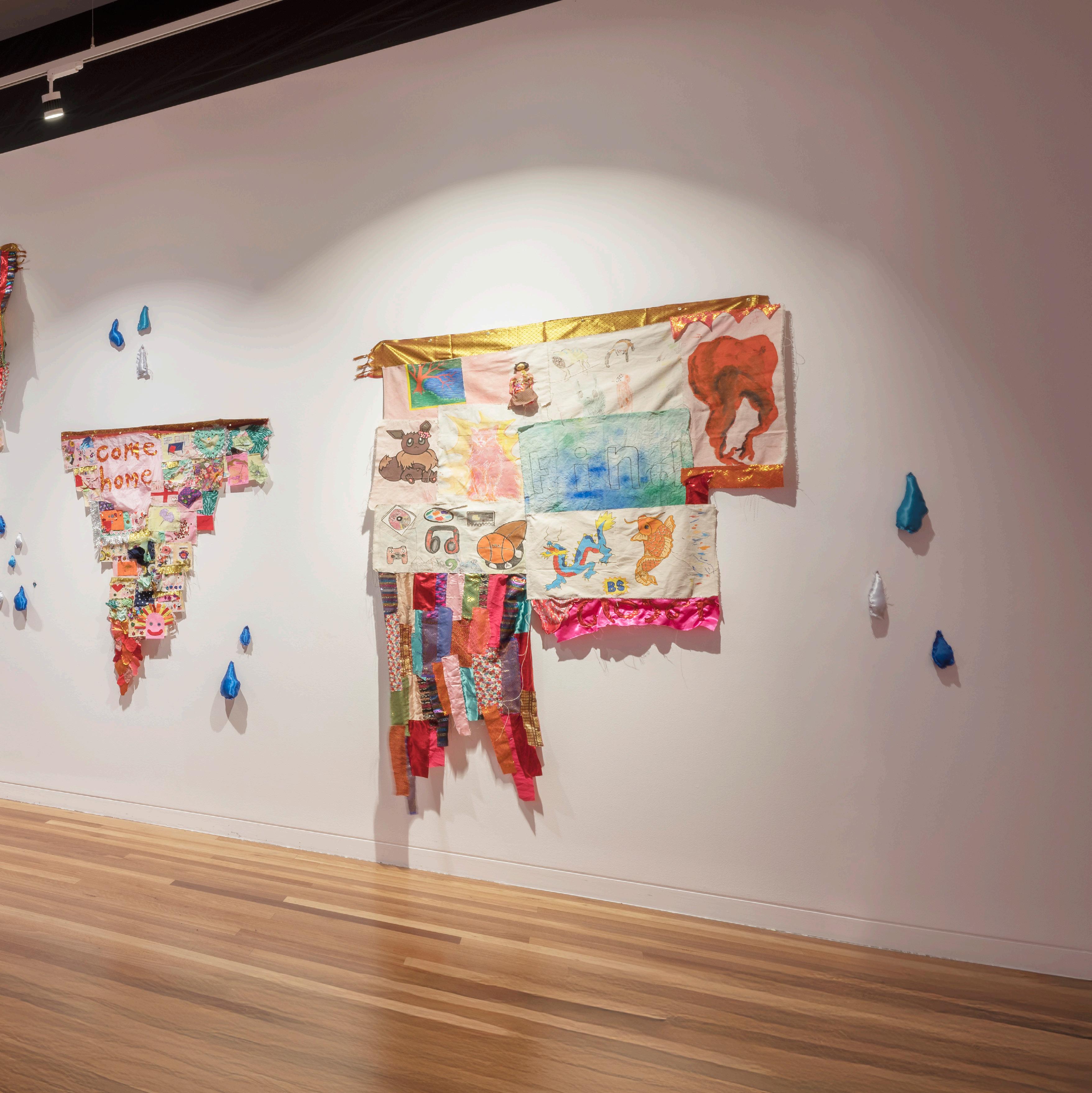 Emma Rani Hodges is of Thai, Chinese, Anglo-Australian heritage, and creates mixed-media, multipattered, textile works that explore intergenerational trauma, migration, multiethnic identity, and community building. Their piece for the exhibition Finding Home, Community Project (2024) centres on themes of safety and community and was developed using a collaborative process that sought to regenerate social connections and foster healing through shared creation. In May 2024, Hodges facilitated a workshop at The Biennale of Sydney, 10,000 Suns, where participants of all ages were given a piece of fabric and asked to recall a person, place, object, memory, or action that made them feel safe. They then used embroidery, collage, painting, or drawing to express their reflections. Hodges also collaborated with participants from the Messengers Program at Tuggeranong Arts Centre — a non-clinical program of weekly art sessions for youth, focused on capacity building and socialisation. Hodges incorporated these contributions into a banner that highlights the universal human need for safety, comfort, and community, and showcasing the healing and unifying power of art.