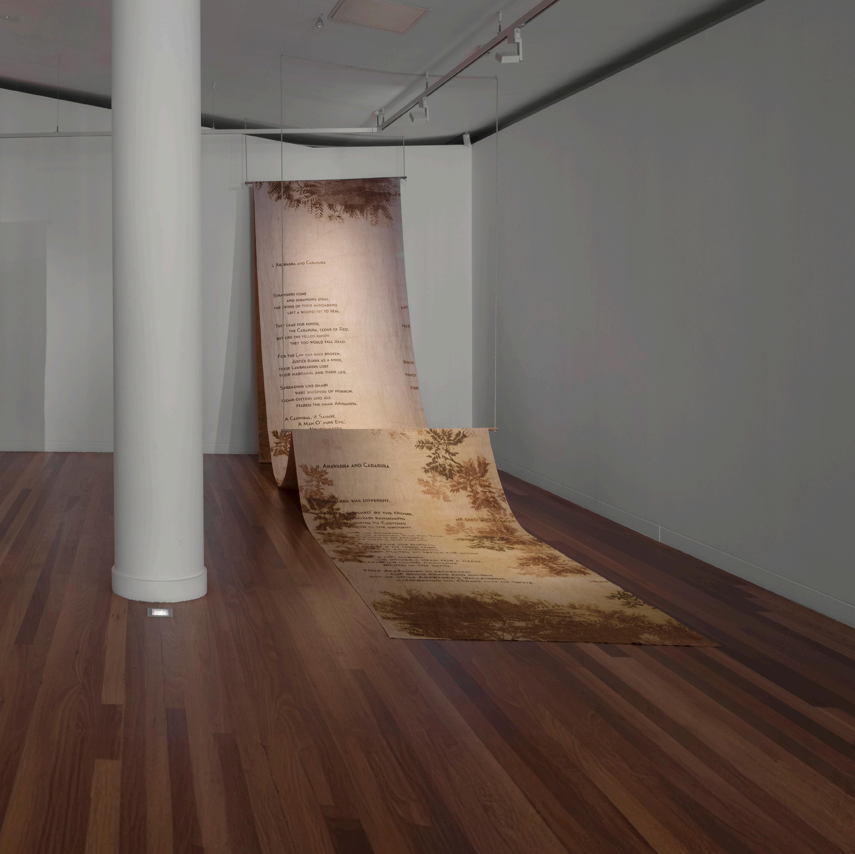 Acacia longifolia, 2022-23, Rope, wooden dowel, linen, hemp, mordant printed and dyed with Acacia longifolia, dimensions variable Poem written by Deidre Martin with Lisa Gorton, 2021-2023