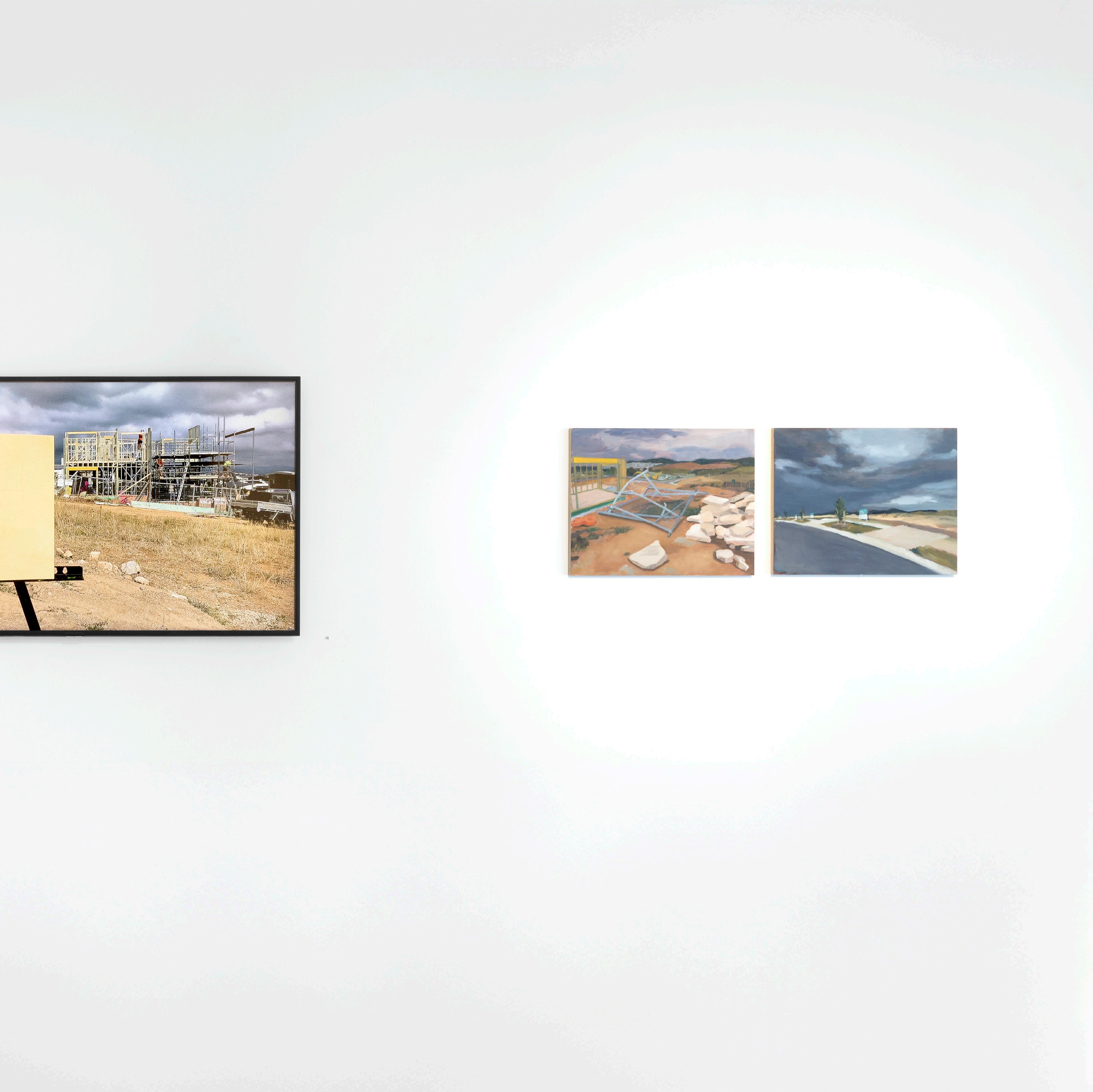 For this exhibition, Hayne presents Whitlam-in-Progress (2024), a series of eight small and medium sized oil paintings on board, with an accompanying video of the artist painting a construction site en plein air. With these works Hayne ponders what histories are embedded in the fabric of place and questions the impact of urban changes. She argues that there is a fine line between the destruction and creation of place, as the landscape is remade into something else, and recognises her own complicity in this process.