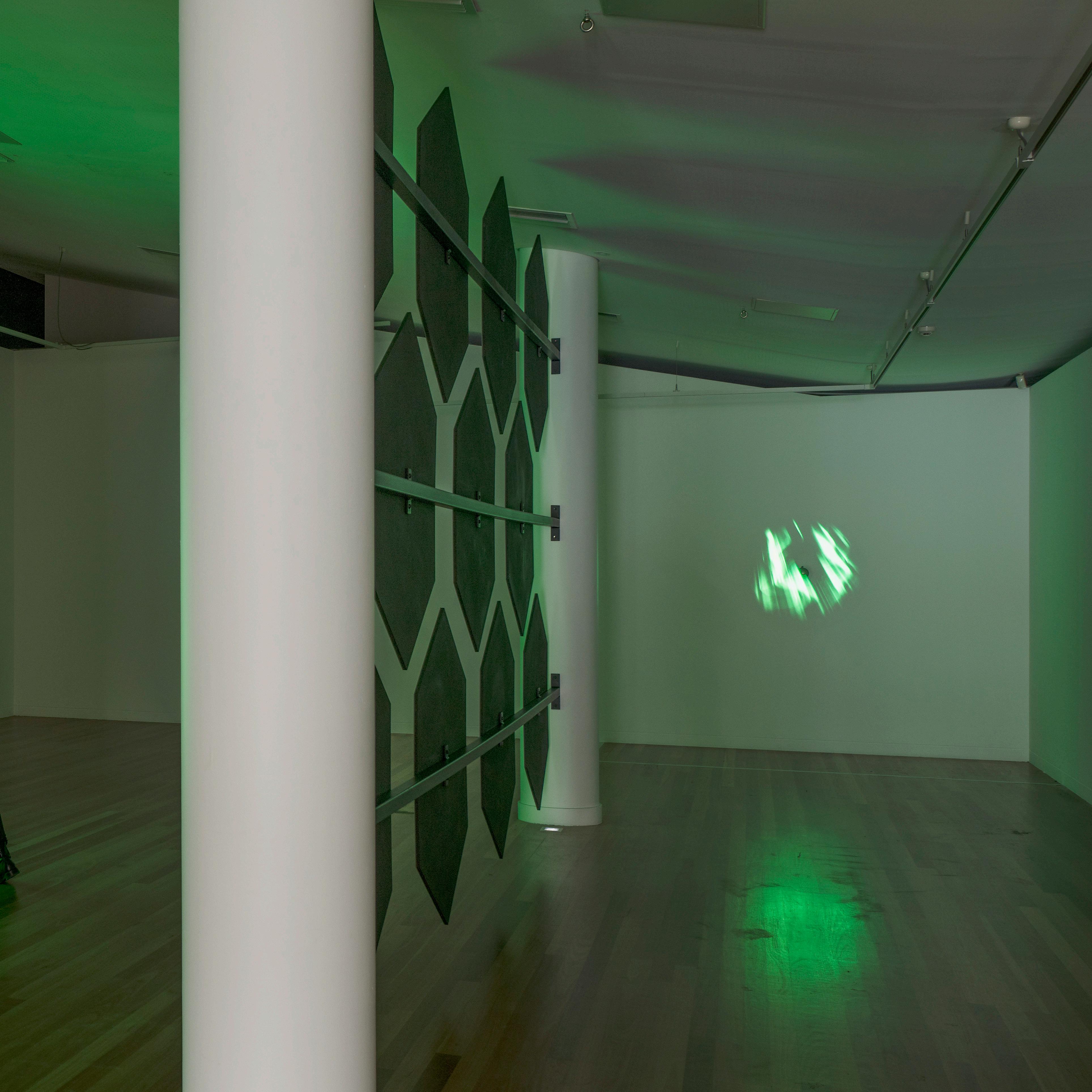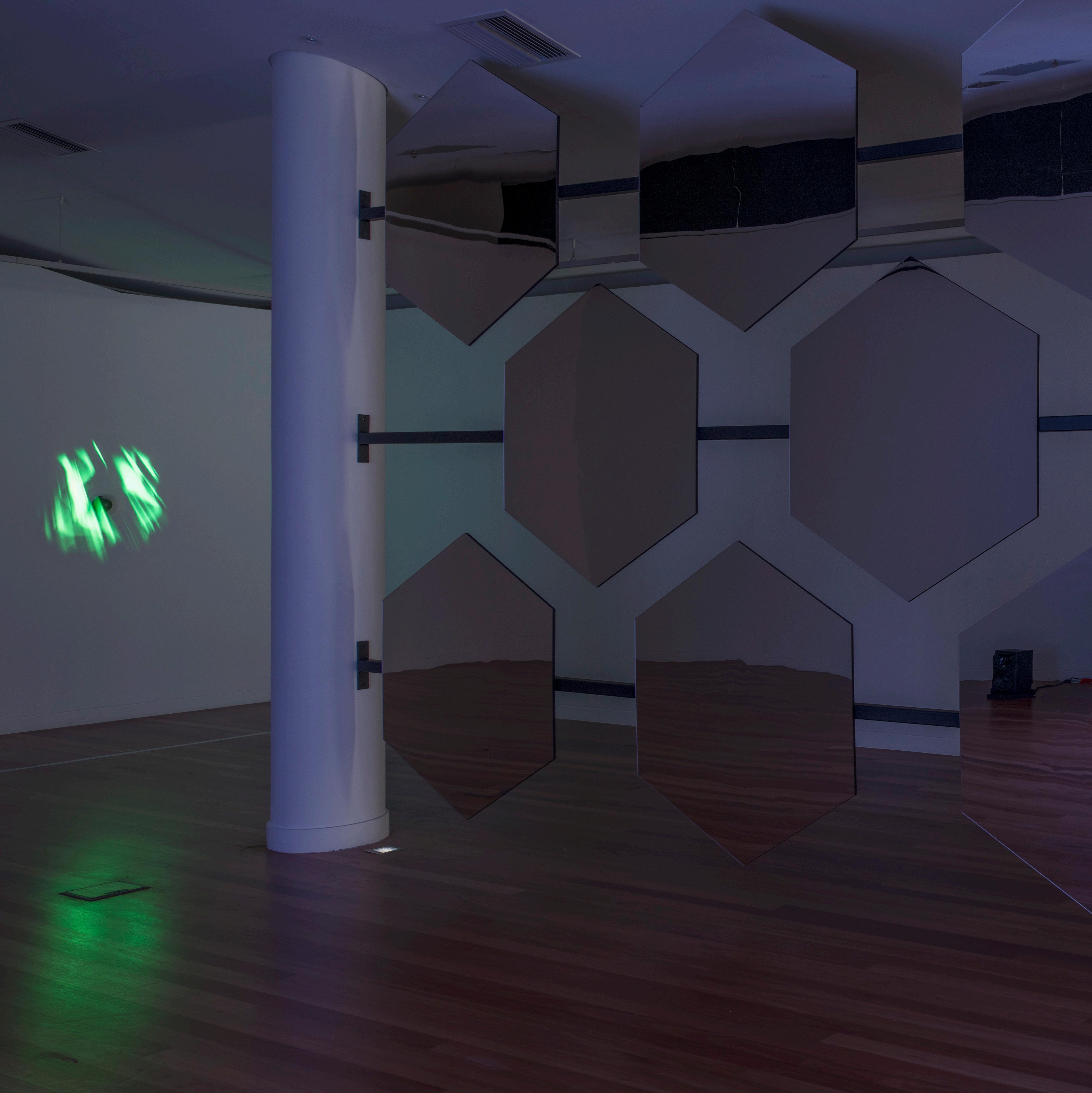 The title of the third and final work in the exhibition, Black Marble 2012 (2022), derives from NASA’s first composite image of Earth at night taken in 2012 and named “Black Marble”. These images used filtering techniques to observe the impact of artificial light pollution caused by city lights, gas flares, auroras, wildfires, and reflected moonlight, to highlight all the human and natural matter that can be detected from space. My Black Marble 2012 work is an intervention between the gallery columns, and uses mirror acrylic, which, like a camera apparatus, controls and captures light. The reflective nature of the material reflects light from Launch Towards the Second Sun, creating a secondary light source. This interaction between the two works symbolises the relationship between the earth and the sun.