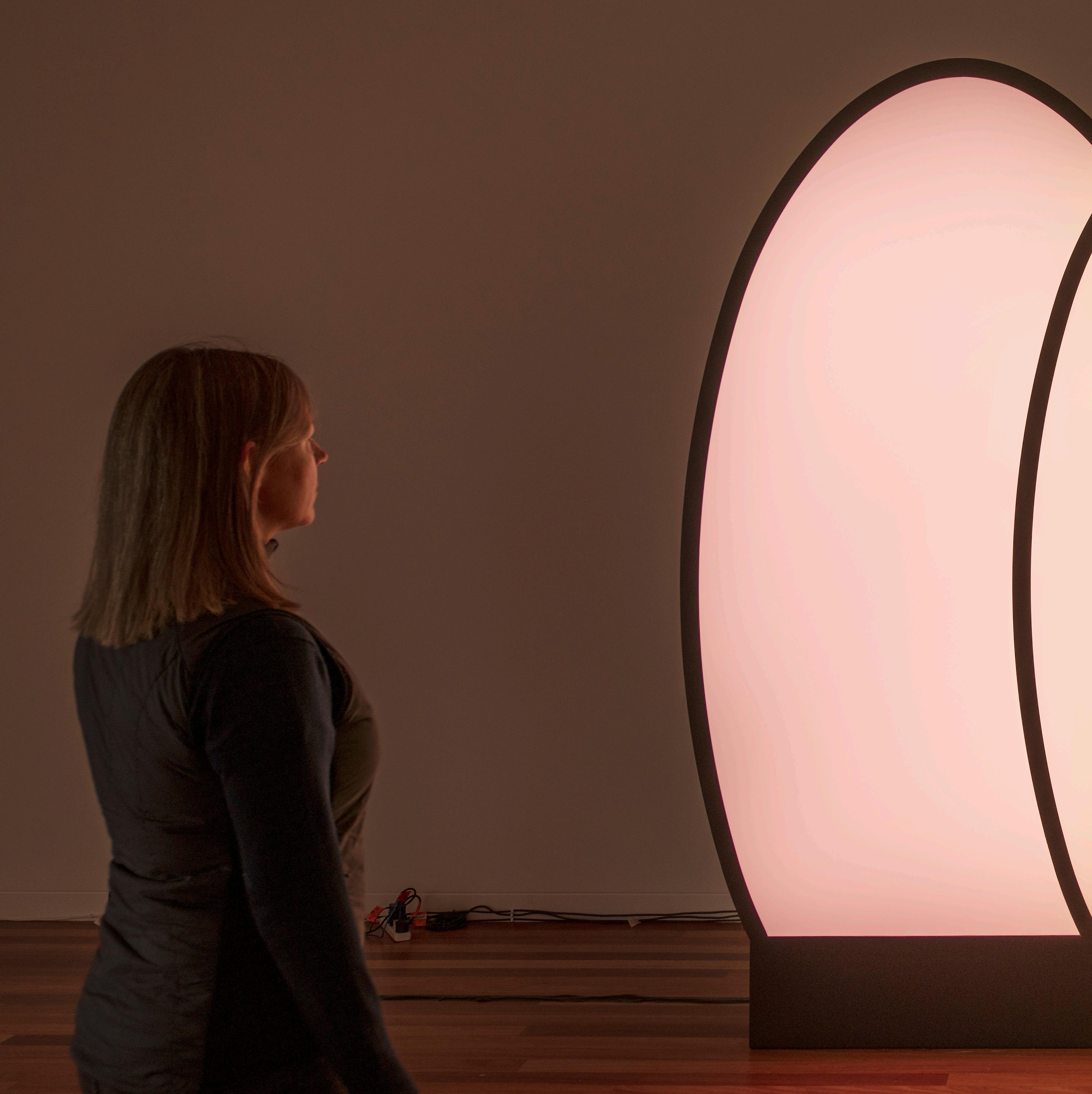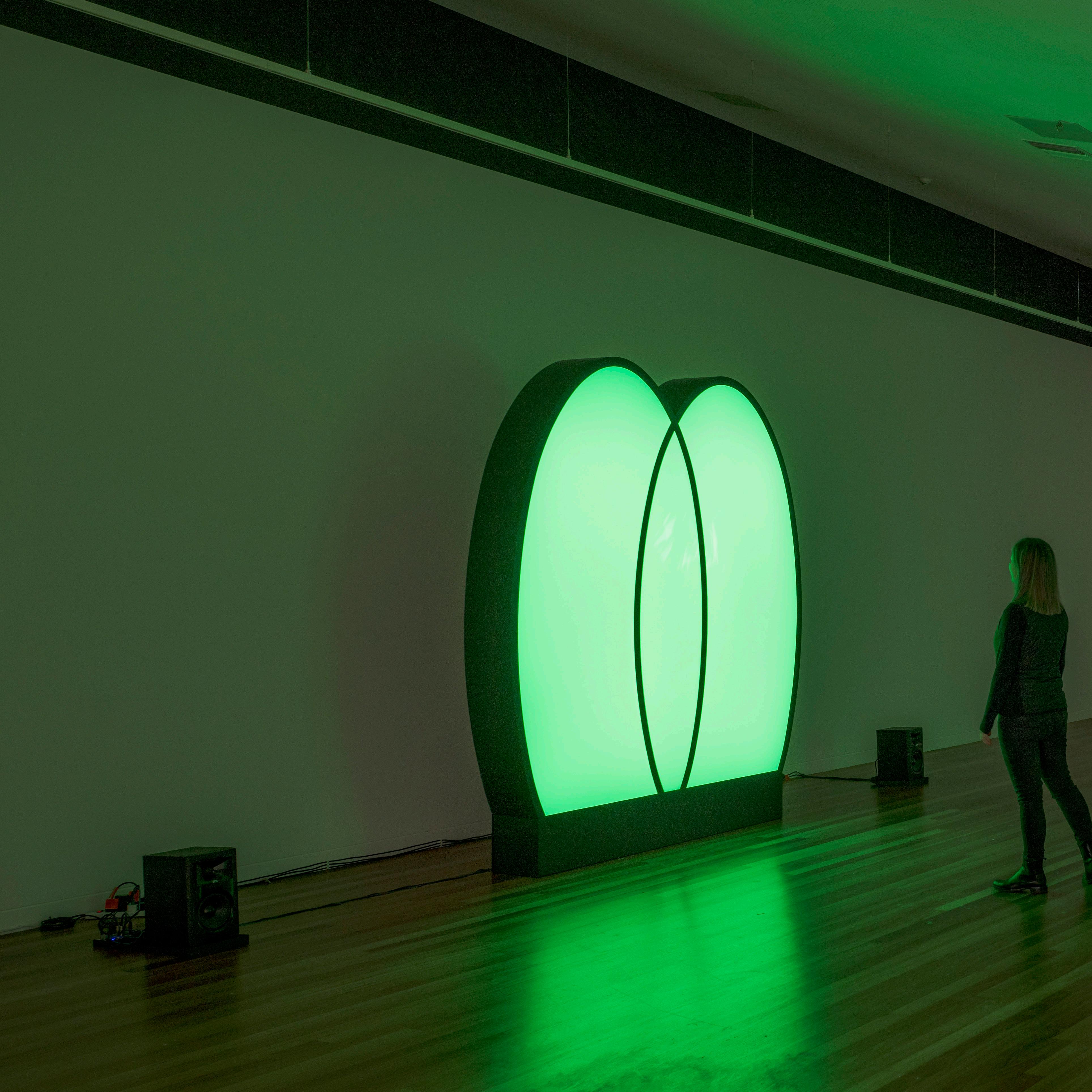 AURORA is a study of light, and brings together a collection of sculptures influenced by the Bauhaus design movement. The title of the main work in the exhibition, Launch Towards the Second Sun (2022), is a quote from Chris Mason’s book The Next 500 Years: Engineering Life to Reach New Worlds (2021), and indicates our reliance on our sun and the energy it provides. As a species, we are dependent on light to exist and thrive. Launch Towards the Second Sun acts as the main light source for the show, and also reflects my ongoing interest in creating programmable autonomous machines. The work responds to both its natural environment and its encounters with humans, in effect communicating through light and shifting with changes in the Canberra environment. Weather, air pressure, wind, humidity, and temperature impact texture, frequency and duration of light through the use of a custom designed algorithm. The work also responds to movement through an infrared sensor. There is also an audio component to this exhibition, which was developed in collaborated with sonic artist Jackie Jenkins, and inspired by the journey that light must take before reaching us.