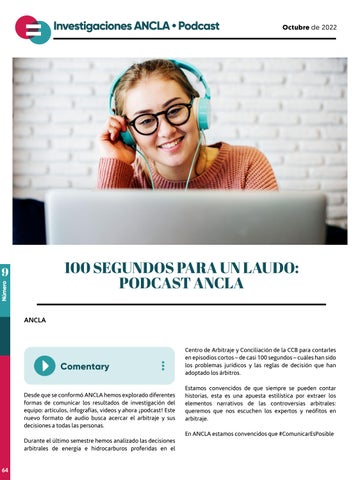 nuestros lectores crezcan. Ratificamos que nuestro compromiso seguirá siendo el de brindar información y contenidos de calidad que estimulen un diálogo riguroso y participativo entorno a los MRC, en particular, del arbitraje. En este número presentamos dos novedades, la primera de ellas es la sección “100 segundos para un laudo”, un formato innovador en el que los investigadores del grupo ANCLA presentan sus análisis sobre los laudos arbitrales. Un formato entretenido, sencillo, pero muy riguroso que deja en evidencia la adaptación de las nuevas generaciones a las formas emergentes de comunicación.