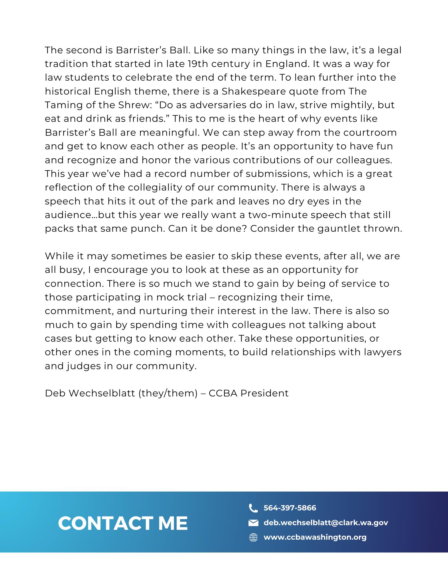 • If local practitioners want to suggest local rule changes, they should forward their request to the Superior Court Administrator, Pamela Hartman Beyer, (Pamela.HartmanBeyer@clark. wa.gov) by mid-March in order to have the request reviewed by the bench. Alternatively, they could submit the request to the Bench Bar Committee at our meeting on March 11th.