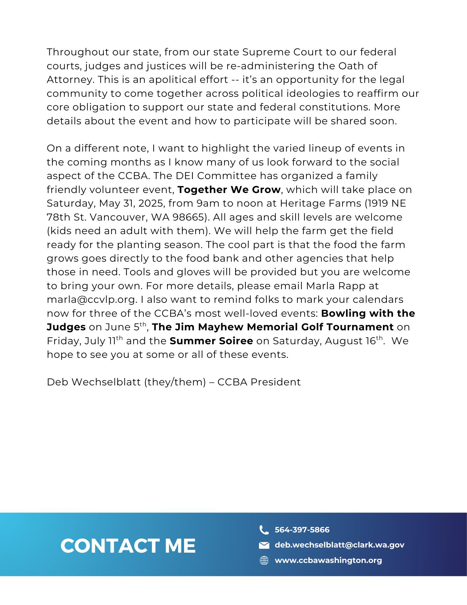 d. CCBA DEI Committee Community Event – May 31st, from 9 a.m. – 12 p.m. (noon) at Heritage Farms – they donate food to Clark County Food Bank. Family friendly. Help prepare the fields for planting. Bring gloves if you want your own, they’ll otherwise have everything you need.