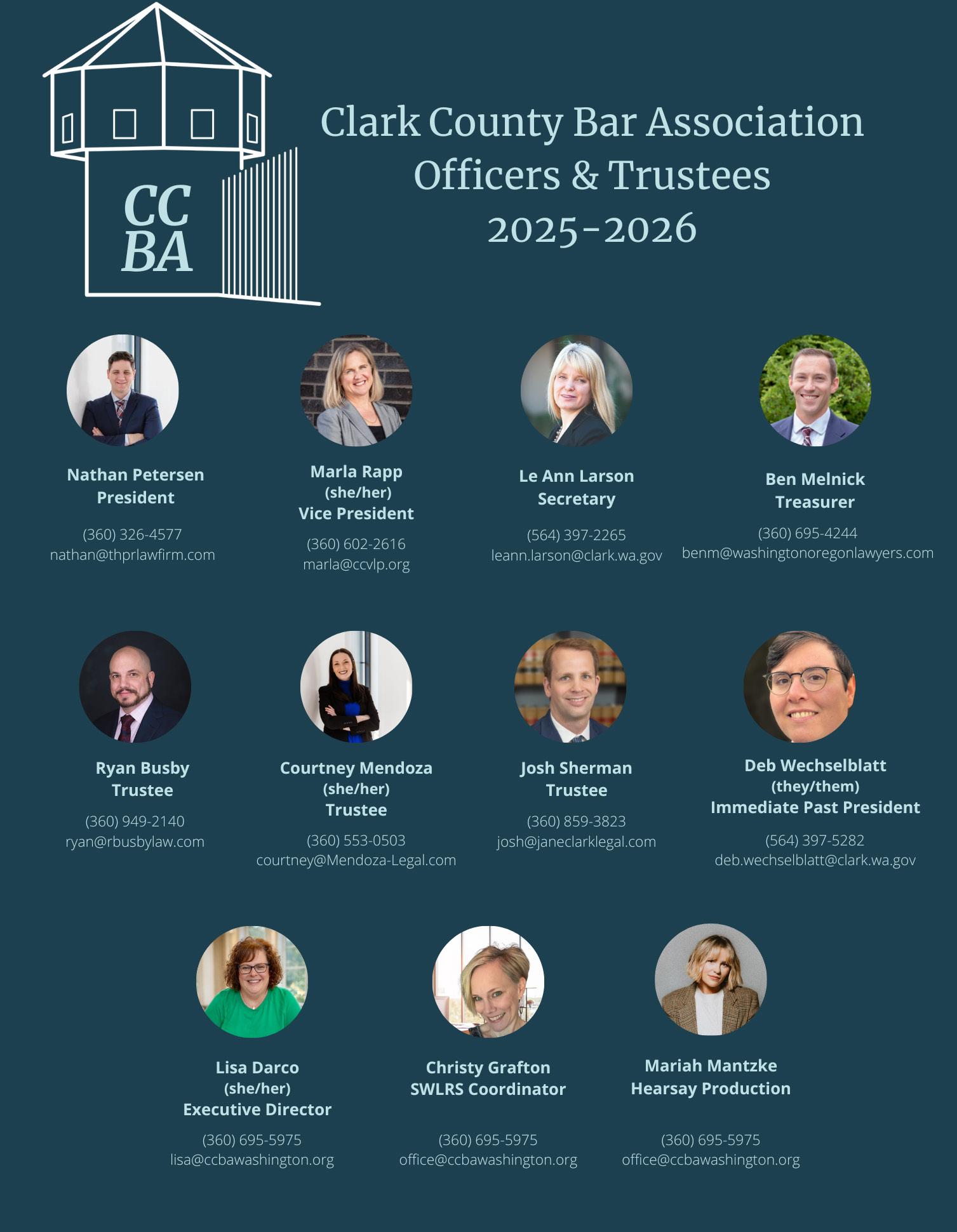We are just over a month away from the 2026 Clark County High School Mock Trial Tournament. It will take place on Wednesday and Thursday, February 18 and 19. There will be three rounds each day starting at 11:00 am, 2:30 pm, and 5:30 pm. Please watch your email for information on how to volunteer your time for this event.