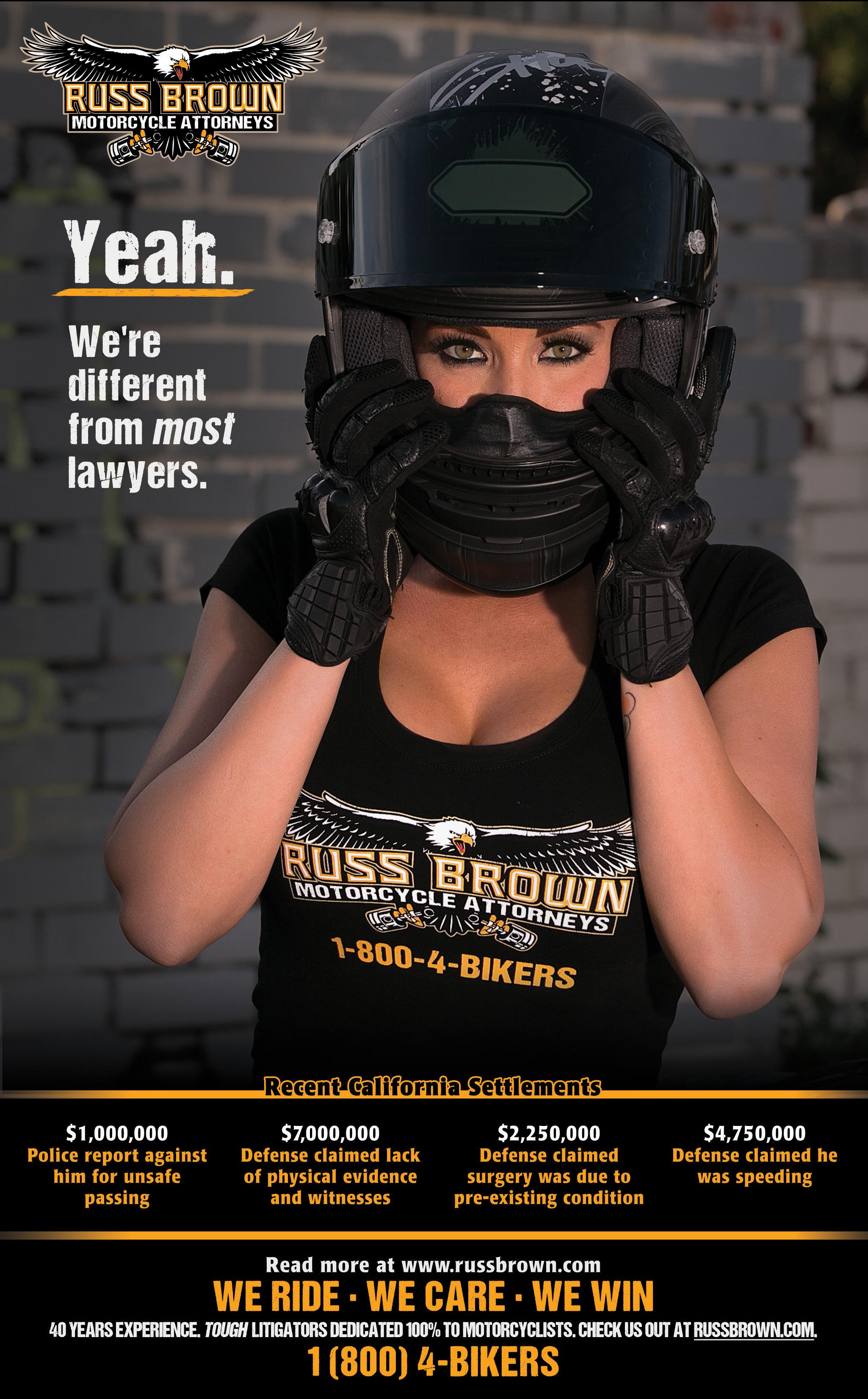 Russ Brown Motorcycle Attorneys 4400 Coldwater Canyon Ave Ste 200 Studio City, CA 800-424-5377 www.russbrown.com